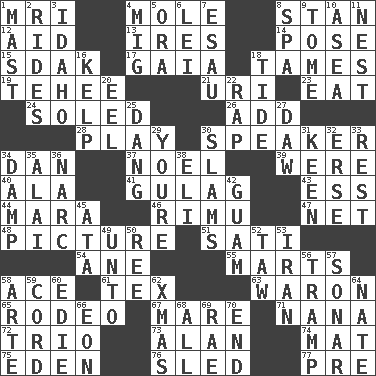ACROSS 1. Medical imaging device (abbr.) 4. Undercover agent 8. Comedian Laurel of Laurel & Hardy 12. Assist 13. Angers 14. Introduce or present, as a question 15. Neighbor of Neb. 17. Greek goddess of the earth (variant) 18. Softens 19. Giggle 21. RI univ. 23. Consume 24. Having a sole or soles 26. Say or write further 28. Live dramatic performance 30. Orator 34. One of the 12 tribes of Israel 37. Christmas carol 39. Past tense of be (plural) 40. According to 41. POW camp 43. Double-curved letter 44. Hindu Mythology: god of death 46. Tall New Zealand timber tree 47. Fish or hair follower 48. Photo 51. Suttee (variant) 54. One (Scot) 55. Shops 58. Adept person 61. John Ritter's dad 63. Make _____ (do battle with) 65. Cowboy competition 67. Female horse 71. Grandmother 72. Musical group of three 73. Actor Alda or Thicke 74. Floor covering 75. Genesis locale 76. Downhill vehicle 77. Before (prefix) DOWN 1. Vertical spar for supporting sails 2. Amusement-park features 3. Potato state 4. Russian fighter aircraft 5. Mouth or opening 6. Flowery wreath 7. Son of Isaac 8. Health resort 9. Heavy book 10. At sea 11. Egg locale 16. Seaweed 18. Event that recurs at intervals 20. Snakelike fish 22. Strike 25. Mild oath, euphamism for damn 27. Obsolete 29. You are 30. Criticizes harshly 31. Peachy ____! 32. Celtic language 33. Remainder 34. Moist 35. Jai _ 36. Drug cop 38. Connecticut Ivy Leaguer 42. Island territory of the United States 45. "One Day ___ Time" 49. To (old English) 50. To separate or throw off 52. The 23rd letter of the Hebrew alphabet 53. SW Asia republic 56. _____ steamer (cargo ship) 57. Underwater navigation system 58. Johnson of "Laugh-In" 59. Drawstring 60. Singer Brickell 62. Dec. holiday 64. Nathan's nickname 66. Age 68. 100% 69. Actress Charlotte 70. Conclusion