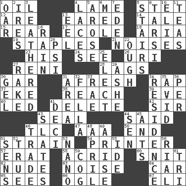 ACROSS 1. Lubricate 4. Unable to walk 8. Proofreading order 12. "We ___ not amused" (Victoria) 13. Having ears or earlike features 14. Falsehood 15. Buttocks 17. Learning spot: Fr. 18. Operatic vocal solo 19. Paper fasteners 21. Annoying sounds 23. Part of HMS, perhaps 24. Perceive with the eye 26. RI univ. 27. Painter Guido (1575-1642) 28. Straggles 30. Slender fish 31. Anew 34. Reproach for some lapse or misdeed 37. Make supply last 38. Arrive at 39. First lady 40. Directed 41. Keyboard key 42. Title for a knight 43. Lick closed 44. Stated 46. Affectionate concern, for short 47. American Automobile Association (abbr.) 50. Conclude 51. Put through a sieve 54. Hard copy producer 57. Part of Q.E.F. 58. Bitter 60. In a ____ (agitated or irritated) 62. Naked 63. Annoying sound 64. 4-wheeled motor vehicle 65. Observes 66. Stare 67. Connecticut Ivy Leaguer DOWN 1. Boat paddle 2. Angers 3. Resembling or made to resemble leather 4. Shoestrings 5. Came up 6. Cartoonist voice _ Blanc 7. Genesis locale 8. Flight of steps 9. Tarsus (plural) 10. Writer Wiesel 11. Beverages made from leaves 13. Snakelike fish 16. Precipitation 20. Air pressure measure (abbr.) 22. Ending for "Through" and "Enough" 25. Opt 27. Immoral or dissolute person 29. American tennis player Robert 30. Set 31. Type of rug 32. Chap (slang) 33. Actress Charlotte 34. Dwelling 35. Enthusiastic 36. For each 41. Tenth: prefix 43. Chalkboards 44. Elected rep. 45. Pismires 46. Barter 48. Showery time 49. Originate 51. Elected reps. 52. Loyal 53. Billionth: prefix 55. Binary compound 56. Monetary unit of Yemen 59. Gear tooth 61. Three (prefix)