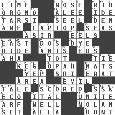 ACROSS 1. Welles in "The Third Man" 5. Sense of smell 9. To free from 12. U. of Maine site 14. Toward shelter 15. Binary compound 16. Tarsus (plural) 17. Sew up the eyelids of hawks and falcons 18. Lair 19. One (Scot) 20. Portable computer 23. Oceans 24. SW Saudi Arabia district 25. Snakelike fish 27. Compass direction 30. Two (Sp.) 32. Color 33. Travel on an animal 34. Pismires 36. Begley and Asner 38. Housemaid (var.) 39. Small child 40. Make a knot 43. Cask 46. Brightly colored fish 48. Floor protectors 49. Slangy assent 51. _ Lanka 52. Part of Q.E.F. 53. Length times width 54. Tending to cause great harm 56. Story 58. Tallied 61. Compass dir. 64. Environmental prefix 65. Slanted text style (abbr.) 66. Join together 68. Sandy's bark 69. 1994 drama film starring Jodie Foster 70. Pitcher Ryan 71. Arrange properly for use 72. Silent film actress Nazimova 73. Do not DOWN 1. Globular water bottle used in Asia 2. SW Asia republic 3. Greater amount 4. Followers of ems 5. Political cartoonist Thomas 6. Butter sub 7. Oozed 8. Snakelike fish 9. Amusement-park features 10. The content of cognition 11. Lairs 13. Petroleums 21. Opera by Verdi 22. Right away 23. Downhill vehicle 24. Had dinner 26. Sight organ 27. Period 28. Direct toward a target or goal 29. Neighbor of Neb. 31. Discontinues 35. A viewer who gazes fixedly 37. Play the lead 41. Call ___ day 42. Eastern Standard Time (abbr.) 44. Jane of fiction 45. Unit of force equal to gravity 47. Hub of activity 48. Cartoonist voice _ Blanc 50. Soft color 53. Upward 55. Goddess of spring and wife of Bragi 56. Beverages made from leaves 57. Land measure 59. Give a ring to 60. Rounded earthenware pot or jar 61. Grain storage tower 62. Comedian Laurel of Laurel & Hardy 63. Gone 65. _ tizzy (2 wds.) 67. Dreamland