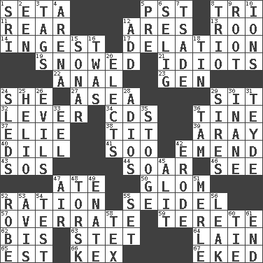 ACROSS 1. Bristle 5. Pacific Standard Time (abbr.) 8. Three (prefix) 11. Rump 12. Ancient Greek god of war 13. Friend of Pooh 14. Consume 17. Conveyance 19. Overwhelmed 21. Foolish or stupid persons 22. Of or related to the anus 23. Commissioned mil. rank 24. A female animal or person 27. At sea 29. Be seated 32. Prying instrument 34. Music discs 36. Prong on a fork 37. Writer Wiesel 38. Teat (slang) 39. Like ___ of sunshine 40. Deli pickle 41. "Barney Miller" actor Jack 42. Make improvements or corrections to 43. Mayday 44. Fly high 46. Perceive with the eye 47. Had dinner 50. Take by theft 52. Food allowance for one day 55. Beer mug 57. Make much ado about nothing 59. Cigar-shaped 62. Altar cloth linen 63. Proofreading order 64. (Had) reclined 65. Eastern Standard Time (abbr.) 66. A weed 67. Made supply last DOWN 1. _ Lanka 2. Car or cant ending 3. Labels 4. Sports stadium 5. Before (prefix) 6. Former Milwaukee Brewers owner Bud 7. Sadhe (variant) 8. Musical group of three 9. Carrot, for example 10. Charged particles 12. Find the sum of 15. Underwater navigation system 16. It was, poetically 18. Shallow baking pan 20. Chooses 24. Bobsleighs 25. Sun: prefix 26. Vices 28. Goodbye (Sp.) 29. Male parents of animals 30. Empty; void 31. Miss Universe 1986, Barbara Palacios _ 33. Snakelike fish 35. Moe Howard, for one 36. Scottish cap 42. Eat (away) 45. Came down and settled, as after flight 47. Atmosphere 48. Cod relative 49. Maternal 51. Haggard of country music 52. Loose flowing garment 53. Opinion 54. Trial 55. Put into a specified state 56. Path through which fluid escapes 58. John Ritter's dad 60. Standoff 61. Conclusion