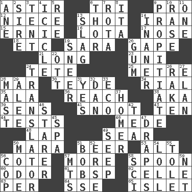 ACROSS 1. Having gotten out of bed 6. Three (prefix) 9. Adept person 12. Sibling's daughter 13. Went for two points 14. SW Asia republic 15. Bert's buddy 16. Globular water bottle used in Asia 17. Characteristic smell of wine 18. And so on (abbr.) 19. "Two Mules for Sister ____" 20. Yawn 21. Having great length 23. Single; one (prefix) 24. False hair 25. Distance measurement (Brit.) 28. Make imperfect 30. Miss Universe 1986, Barbara Palacios _ 34. Monetary unit of Yemen 35. In the manner of 36. Arrive at 38. Alias (abbr.) 39. Elected reps. 41. Snout, nose 43. "___ Little Indians" 44. Trials 46. Ancient Persian 48. Pet locale 49. Wither 50. Hindu Mythology: god of death 51. Fermented drink made from hops 53. Keyboard modifier key 56. ____ d'Azur (French Riviera) 57. Greater amount 58. Soup utensil 60. Aroma 61. Cook's measure (abbr.) 62. Cell (Danish) 63. For each 64. Compass dir. 65. Small island DOWN 1. A saturated hydrocarbon 2. Beget 3. Portable shelter 4. Ice on the eave 5. To sift 6. Son of Odin 7. Round or rotation of duties 8. Call ___ day 9. Appease 10. Raze (variant) 11. Single 13. Volcanic refuse 14. More empty; more void 19. Scornful expression 20. Chewing product 22. Baseball player Mel 24. Interpreter 26. Immoral or dissolute person 27. Flair 28. Vertical spar for supporting sails 29. Toward shelter 31. It is so 32. Daniel's nick name 33. Environmental prefix 37. Homing pigeon 40. A viewer who gazes fixedly 42. Beverage made from leaves 45. Health resort 47. Window treatments 49. Ooze 50. Method 51. Moves up and down 52. Celtic language 54. Hang loosely or laxly 55. Lacquered or enameled metalware 56. Police officer (slang) 57. Mountains (abbr.) 58. _-fi 59. Fish or hair follower