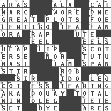 ACROSS 1. Caspian sea tributary 5. According to 8. Feline 11. Drug cop 12. Had on 14. Single 15. Relatively large 17. Graphs 18. Enemy 19. Small, flat, pigmented spot on the skin 21. Beverage made from leaves 22. Avid follower 23. Mouth or opening 24. Strike 25. Shoshoni 27. Snakelike fish 28. Snakelike fish 31. Pile 35. Mouth edge 37. Native of Scotland 38. Celtic language 39. Not either 41. Ballerina skirt 42. Political cartoonist Thomas 43. Scottish cap 45. Connect, as a bridge 46. Move through with a circular motion 47. Director Reiner 49. Title for a knight 51. Wedding promise 52. Lion 55. Small bed 57. Double-curved letter 60. Pulling into pieces 62. Alias (abbr.) 63. A city in N France, SE of Calais 65. "_____ Recall" 66. Acquire through effort 67. Cassini of fashion 68. False hair 69. Arrange properly for use 70. Color 71. Ancient Greek god of war DOWN 1. White American of non-Hispanic descent 2. More uncommon 3. Sports stadium 4. Go away! 5. Leather borer 6. Spoils 7. Johnson of "Laugh-In" 8. Java holder (2 wds.) 9. Small Philippine buffalo 10. Adolescent 13. Son of Isaac 16. Hoop that covers a wheel 17. Cotton for raincoats, e.g. 20. Highlander 26. Trials 29. Globular water bottle used in Asia 30. Astound 31. Coop moms 32. Part of Q.E.F. 33. Helper 34. _ dish (used to culture cells) 36. Cooking vessel 40. Noteworthy scarcity 44. Method 48. Water vessel 50. Redecorate 52. 61 cubic inches 53. Maternal 54. Stares 55. Crow sounds 56. Migrant worker of the '30s 58. Disposed of to a purchaser 59. Chop _ 61. Roll call or roster of names 64. Mature