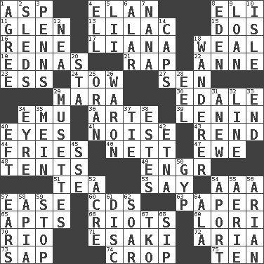 ACROSS 1. Viper 4. Style 8. Connecticut Ivy Leaguer 11. Small, secluded valley 13. Pale purple color 15. Two (Sp.) 16. French philosopher Descartes 17. Woody, climbing, usually tropical plant 18. Welt 19. Ferber et al. 21. Reproach for some lapse or misdeed 22. Singer Murray 23. Double-curved letter 24. Pull behind 27. Elected rep. 29. Hindu Mythology: god of death 30. Peak District village in England 34. Australian flightless bird 36. Johnson of "Laugh-In" 39. Soviet premier 1918-24 40. Sight organs 41. Annoying sound 43. Tear apart 44. Strips of potato fried in deep fat 46. Remaining after all deductions 47. She-sheep 48. Portable shelters 49. Engineer (abbr.) 51. Beverage made from leaves 53. Declare 54. Auto club (abbr.) 57. Relaxation 60. Music discs 63. Some stationery 65. Tenement units (abbr.) 66. Disturbances 69. Australian parrot (variant) 70. _ de Janeiro 71. 1973 Nobel Price Winner (Physics) Leo 72. Roberta Peters solo 73. Plant excrement 74. Riding implement 75. "___ Little Indians" DOWN 1. Match 2. Bobsleighs 3. Actor Sean's family 4. Pipe bend 5. Cards in a Roman deck? 6. Having or resembling wings 7. Grandmother 8. Locale of original sin 9. Grant temporary use of 10. Small island 12. Teachers' org. 14. Balmoral and tarboosh 18. Roamer 20. R.R. building 25. NW Algerian seaport 26. Make _____ (do battle with) 28. Snakelike fish 29. French bagpipes 31. Afresh 32. Actor's bit 33. Conclude 34. Jane of fiction 35. Chow _ 37. Standoff 38. _____ Park, CO 40. Bank Draft (abbr.) 42. Inactive volcano in Sicily 45. Compass dir. 50. Hustle 52. Measure of real estate 54. To the left, to Queeg 55. Nest on high 56. Believer in; advocate of (suffix) 57. Hearing organs 58. Capital of Western Samoa 59. Halt 61. Flat circle 62. Fly high 64. In the manner of 67. Ring climax 68. Small drink