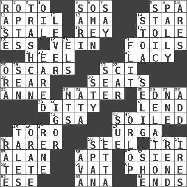 ACROSS 1. Printing process, for short 5. Distress signal 8. Health resort 11. Showery time 13. Nursemaid (var.) 14. Play the lead 15. Lacking originality or spontaneity 16. Marina Del _, California 17. Lacquered or enameled metalware 18. Curvy letter 19. Distinctive style or manner 21. Fencing necessities 22. The bottom of a shoe or boot 24. Made of lace 25. Motion picture awards 27. _-fi 29. Stern 30. Theater features 32. Singer Murray 33. Mother 35. Pulitzer Prize-winning author Ferber 39. Short, simple song 41. Grant temporary use of 42. Girls' org. (abbr.) 43. Dirtied 45. "Corrida" creature 48. Capital and largest city of Mongolia 49. More valued for its uncommonness 50. Stitch closed the eyes of (a falcon) 52. Three (prefix) 55. ____ Jay Lerner 56. Fitting 57. Flexible twig of a willow tree 59. False hair 60. Large container 61. Give a jingle 62. Compass dir. 63. Santa ___, CA 64. Conclusions DOWN 1. To erase 2. Elects 3. File 13 4. Lubricate 5. Indian skirt 6. Presage 7. Declare 8. Unemotional 9. Friendly 10. Ancient Greek god of war 12. Prying instrument 14. Portico 20. Raised railways 21. Secret move to avoid paying debts 23. Having ears or earlike features 25. Mouth or opening 26. Elected rep. 27. Perceive with the eye 28. Auto 30. Filthy place 31. Former Milwaukee Brewers owner Bud 33. Mountains (abbr.) 34. _ moment's notice (2 wds.) 36. Accusation by an informer 37. Compass dir. 38. Say or write further 40. Composer Stravinsky 43. Take to court 44. Lowest deck of a ship 45. Stories 46. Speak pompously 47. French philosopher Descartes 49. Pace 50. Connect, as a bridge 51. Singer James 53. Tear apart 54. Angers 56. Actress Gardner 58. A female animal or person