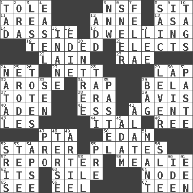 ACROSS 1. Lacquered or enameled metalware 5. Science/research agcy. 8. Be seated 11. Length times width 12. Singer Murray 13. White ___ sheet 14. Small ungulate mammals of Africa 17. Residence 19. Looked after 21. Opts 22. (Had) reclined 23. Actress Charlotte 24. Fish or hair follower 27. Remaining after all deductions 29. Infant locale 32. Came up 34. Hit sharply and swiftly 36. Actor Lugosi 37. Carry 38. Epoch 39. Advice 40. An important port of Yemen 41. Curvy letter 42. Rep 43. French article 44. Slanted text style (abbr.) 46. To separate or throw off 47. Parent Teacher Assoc. 50. Dutch treat 52. A viewer who gazes fixedly 55. Food holders 57. News announcer 59. Ear of corn 62. It is 63. Drop; flow; fall 64. Thickened enlargement 65. Observe 66. Snakelike fish 67. Adolescent DOWN 1. Small boy 2. Mouth or opening 3. For fear that 4. Artist's stand 5. Compass dir. 6. Scornful expression 7. Chap (slang) 8. Ketch in the Levant 9. Is not 10. Labels 12. Find the sum of 15. Silly 16. Singer Brickell 18. Area sheltered from the wind 20. Main course 24. Brizilian seaport 25. Wear away 26. Hauls 28. Tarsus (plural) 29. Prying instrument 30. Place in a line 31. Thick mixture 33. Elected rep. 35. Soft color 36. Paper or plastic container 42. Having winglike extensions 45. First of billions? 47. Adept person 48. Laconic 49. Nick name for Arthur 51. Intended 52. Indian titles of respect 53. False hair 54. Domed church section 55. Before (prefix) 56. _ gin 58. Pipe bend 60. Binary compound 61. Car or cant ending