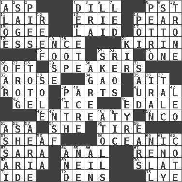 ACROSS 1. Viper 4. Deli pickle 8. Pacific Standard Time (abbr.) 11. Den 13. 4th largest of the Great Lakes 14. Lightbulb-shaped fruit 15. Double curve, resembling the letter S 16. Put down 17. Von Bismarck 18. Substance 21. Japanese brewing company 22. Pick up the tab 23. _ Lanka 25. Single 26. Often (poetically) 29. Orators 32. Came up 34. E Mali city 35. Small island 38. Printing process, for short 39. Actors' quests 41. Mountain range 43. Set 44. Frozen water 45. Peak District village in England 46. Plea 50. Non-commissioned officer (abbr.) 51. White ___ sheet 54. A female animal or person 55. Become fatigued 57. Bundle of cut stalks of grain 59. Pertaining to the sea 63. "Two Mules for Sister ____" 64. Of or related to the anus 67. San ____ (Riviera town) 68. Roberta Peters solo 69. Famous astronaut Armstrong 70. Narrow board 71. Binary compound 72. Cub Scout units 73. Sodium hydroxide DOWN 1. _ vera 2. Sinks 3. Sliced desserts 4. Keyboard key 5. Lyricist Gershwin 6. Cards in a Roman deck? 7. Directed 8. Stone: prefix 9. Smooth fabric 10. Marketplace scale 12. Coral ridge 14. Luau course 19. Olfactory organ 20. Police officer (slang) 21. Apertif with cassis 23. Three-handed card game 24. Vintage cars 26. Rowing implement 27. Toadlike animal 28. Carry 30. Match 31. Saudi Arabian king (1953-1964) 33. Flatfish 36. SW Asia republic 37. Baby powder 39. Essential or central part 40. Measure of real estate 42. Lion 45. Jane of fiction 47. Science/research agcy. 48. Ringlike coral islands and reefs 49. Nervous spasm 51. Slender Brazilian palm 52. Broken piece 53. Nest on high 56. Hearing organs 58. American Automobile Association (abbr.) 60. 1994 drama film starring Jodie Foster 61. "If ____ say so..." 62. ____ d'Azur (French Riviera) 64. Plus 65. Born 66. The 18th letter of the Arabic alphabet