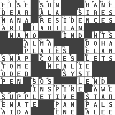 ACROSS 1. Otherwise 5. Manchild 8. Object of repulsion 12. Letter starter 13. Wing 14. Titles for men of rank and authority 15. Grandmother 16. Homes 19. Nonscientific branch of learning 20. Of or relating to Laos or its people 21. Billionth: prefix 23. Indiana (abbr.) 24. Mountains (abbr.) 27. _ mater 30. Capital of the state of Qatar 31. Food holders 34. Style 35. Fastener 38. Popular sodas 40. Allows 41. Heavy book 42. Ear of corn 44. Wrote a lyric poem 45. System (abbr.) 46. Fenced enclosure 47. Mayday 50. Grant temporary use of 53. Stimulate to action 57. Deep reverence 59. Supplementary 63. Play the lead 64. Maternal 65. Baking dish 66. Friends 67. Opera by Verdi 68. Compass dir. 69. Toward shelter DOWN 1. Pulitzer Prize-winning author Ferber 2. Acquire or gain knowledge or skills 3. Before Barbara or Clara 4. Period 5. "Two Mules for Sister ____" 6. Butter sub 7. Political cartoonist Thomas 8. Storage container 9. Curve 10. Born 11. Curvy letter 14. Transmit 17. One more than two 18. One of the 12 tribes of Israel 20. Hang loosely or laxly 22. Slept 24. Undercover agent 25. Not this but _ 26. Without 28. Big _ 29. Tiny particle 30. Erase 32. Supplement with great effort 33. Oceans 35. Close up, plug up 36. Connecting point 37. So be it 39. Roguish 43. Small island 47. Filth; sediment 48. Single 49. Fast jet (abbr.) 51. Relating to or accompanying birth 52. A sleeping potion; an opiate (poet.) 54. Corncob 55. "Terrible" tsar 56. French philosopher Descartes 58. Celtic language 59. Ocean 60. Single; one (prefix) 61. Groovy apt. 62. Parent Teacher Association (abbr.) 63. Health resort
