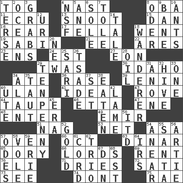 ACROSS 1. Coat; cloak 4. Political cartoonist Thomas 8. Chief or king in Benin or Nigeria 11. Shade of tan 13. Snout, nose 15. Daniel's nick name 16. Bring up, as a child 17. Man or boy (slang) 18. Left 19. Unit of acoustic absorption 21. Snakelike fish 22. Ancient Greek god of war 23. Followers of ems 24. Eastern Standard Time (abbr.) 27. Age 29. It was, poetically 30. Potato state 34. Had dinner 36. Raze (variant) 39. Soviet premier 1918-24 40. ____ Bator, Mongolia 41. Standard of perfection 43. Be footloose 44. Grayish beige 46. Singer James 47. Compass dir. 48. Keyboard key 49. Independent ruler or chieftain 51. Tired old horse 53. Fish or hair follower 54. White ___ sheet 57. Baking chamber 60. Sep. follower 63. Middle Eastern gold or silver currency 65. Rowboat 66. Nobles 69. Monthly bill 70. Connecticut Ivy Leaguer 71. Frees from moisture 72. Suttee (variant) 73. Perceive with the eye 74. Do not 75. Actress Charlotte DOWN 1. Laconic 2. Sea 3. Takes hold of 4. Science/research agcy. 5. One (Scot) 6. Not divided or shared with others 7. Lacquered or enameled metalware 8. River in Europe 9. Object of repulsion 10. Pismires 12. RI univ. 14. Story 18. Nomad 20. ___ Haven, CT 25. Indian skirt 26. Sadhe (variant) 28. Petroleum 29. 3-inch nail 31. At once, immediately (arch.) 32. Hub of activity 33. Single 34. ____ Jay Lerner 35. Pulled tight 37. Arrange properly for use 38. Consumed 40. Shoshoni 42. Unable to walk 45. Period 50. It would 52. Gilt 54. Approach 55. Before Barbara or Clara 56. Nick name for Arthur 57. Lyric poems 58. Short-tailed, large-bodied rat 59. 4th largest of the Great Lakes 61. Drawstring 62. Musical group of three 64. Big collection agency 67. Lair 68. Fast jet (abbr.)