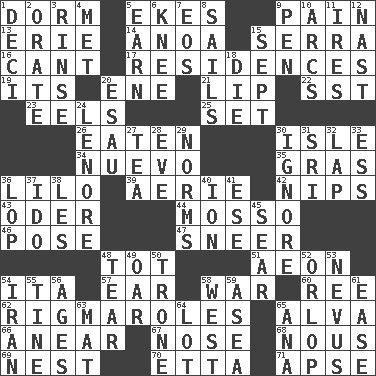 ACROSS 1. Dormintory (informal) 5. Supplements with great effort 9. Ache 13. 4th largest of the Great Lakes 14. Small Philippine buffalo 15. Spanish missionary in California 16. Patter 17. Dwellings 19. ___ a Wonderful Life 20. Compass dir. 21. Mouth edge 22. Fast jet (abbr.) 23. Snakelike fish 25. Put into a specified state 26. Consumed 30. Small island 34. New (sp.) 35. Pate de foie ____ 36. _ and Stitch 39. Nest on high 42. Pinches, bites 43. River in Europe 44. With motion or animation 46. Airs 47. Scornful expression 48. Small child 51. A really long time 54. Call ___ day 57. Hearing organ 58. Armed conflict 60. To sift 62. Frustrating wastes of time 65. Inventor's middle name 66. Approach 67. Characteristic smell of wine 68. Common sense 69. A home for chicks 70. Singer James 71. Domed church section DOWN 1. Tenth: prefix 2. Speak pompously 3. Remove soap 4. Was introduced to 5. Merit 6. Leg joint 7. Greek goddess of the dawn 8. Travel by water 9. Writing instrument 10. Arches 11. Angers 12. Political cartoonist Thomas 15. Back-to-school mo. 18. Expire 20. He sold his birthright 24. Poe poem 27. Beverage made from leaves 28. Night before a holiday 29. Typical models 30. Fail to notice 31. _ Lanka 32. Pet locale 33. Curvy letter 36. Trim (branches) 37. Wedding promise 38. French article 40. Electrically charged atom 41. Compass dir. 45. Wither 48. Separate forcefully 49. Rowing implement 50. Heavy duty weighing machine 52. Lowest deck of a ship 53. Mole, birthmark 54. SW Asia republic 55. Prong on a fork 56. Eras 58. 270 degrees 59. At sea 61. Comfort 63. Floor covering 64. Car dealer's back yard 65. Santa ___, CA