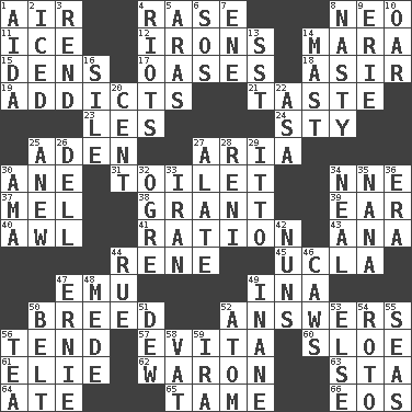 ACROSS 1. Wind 4. Raze (variant) 8. Modern: prefix 11. Frozen water 12. Removes the wrinkles 14. Hindu Mythology: god of death 15. Habitations of wild animals 17. Fertile tracts in a desert 18. SW Saudi Arabia district 19. Inveterate users 21. Clothes sense 23. French article 24. Filthy place 25. An important port of Yemen 27. Roberta Peters solo 30. One (Scot) 31. Rest room 34. Compass dir. 37. Cartoonist voice _ Blanc 38. Let have 39. Ewer handle 40. Leather borer 41. Food allowance for one day 43. Santa ___, CA 44. French philosopher Descartes 45. Southern CA. univ. 47. Australian flightless bird 49. _ tizzy (2 wds.) 50. A special lineage 52. Responds (to) 56. Be inclined (to) 57. Webber/Rice musical 60. A type of plum 61. Writer Wiesel 62. Make _____ (do battle with) 63. R.R. building 64. Had dinner 65. Docile 66. Greek goddess of the dawn DOWN 1. Opera by Verdi 2. On the rocks 3. Tear apart 4. Disturbances 5. Ancient river in northeast Turkey 6. Mayday 7. Compass dir. 8. Smutty 9. One of the Great Lakes 10. Rowing implement 13. Fast jet (abbr.) 14. Vertical spar for supporting sails 16. Filth; sediment 20. Penny 22. White ___ sheet 25. Afresh 26. Small valley 27. Having winglike extensions 28. Painter Guido (1575-1642) 29. "Tell ____ the Marines!" 30. Nursemaid (var.) 32. Legendary monster 33. SW Asia republic 34. Anneal 35. Grandmother 36. Period 42. Religious women 44. Regret 46. Crow sounds 47. Bert's buddy 48. Ancient Persian 49. Lacking in sense or substance 50. Waist strap 51. Morning condensation 52. Smallest unit of an element 53. Otherwise 54. Printing process, for short 55. Oceans 56. Beverage made from leaves 58. Large container 59. Retirement account (abbr.)
