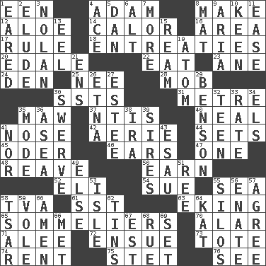ACROSS 1. Car or cant ending 4. First of billions? 8. Cause to be 12. _ vera 14. Bodily heat indicating an inflammation 16. Length times width 17. Governing power 18. Pleas 20. Peak District village in England 22. Ingest 23. A saturated hydrocarbon 24. Lair 25. Born 28. Disorderly crowd 30. Fast planes 31. Distance measurement (Brit.) 35. Informal term for the mouth 37. Nuclear Threat Initiatives 40. Be tempered by heat 41. Characteristic smell of wine 42. Nest on high 44. Arranges properly for use 45. River in Europe 46. Hearing organs 47. Single 48. Rob, plunder, or pillage 50. Merit 52. Connecticut Ivy Leaguer 54. Institute legal proceedings 55. Ocean 58. Federal power corp. 61. Fast jet (abbr.) 63. Supplementing with great effort 65. Wine waiters 70. Having or resembling wings 71. Toward shelter 72. Follow as a consequence or result 73. Lug 74. Monthly bill 75. Proofreading order 76. Observe DOWN 1. Having ears or earlike features 2. Dodge 3. Pitcher Ryan 4. Adept person 5. Daniel's nick name 6. Keyboard modifier key 7. Greater amount 8. Floor protector 9. Roberta Peters solo 10. Peachy ____! 11. Comfort 13. Snakelike fish 15. 480, 500 or 516 sheets of paper 19. Smallest unit of an element 21. Followers of ems 26. Inactive volcano in Sicily 27. First name in cosmetics 29. Gillaume's butler role 30. Turn aside suddenly 32. Adolescent 33. Pace 34. Raised railways 35. Method 36. Toward the sea 38. Retirement account (abbr.) 39. Founders of families 41. Or not 43. He sold his birthright 49. Otherwise 51. To separate or throw off 53. Small island 55. Grain storage towers 56. Related on the mother's side 57. Match 58. Russian ruler of old 59. Grand slam 60. So be it 62. Canisters 64. Krazy ___ of comics 66. Was introduced to 67. Eastern Standard Time (abbr.) 68. Regret 69. Put into a specified state