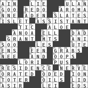 ACROSS 1. The 18th letter of the Arabic alphabet 4. Untruth 7. ____ Bator 11. Thick or sticky substance 12. Redecorate 13. Scent 14. Compass dir. 15. An important port of Yemen 16. Chalkboards 17. Small island 19. Helper 21. Nervous spasm 23. Medicinal plant 24. Small Philippine buffalo 25. Pipe bend 26. Male parent 29. Let have 30. Mountains (abbr.) 31. Cuckoo 32. "Barney Miller" actor Jack 33. French article 34. Shoshoni 35. Followers of ems 36. Car or cant ending 37. Catches 40. Born 41. Also 42. I made a mistake 43. Australian parrot (variant) 45. Purulenc 46. Dwelling 51. Effrontery 55. Declaimed 56. Wrote a lyric poem 58. Electrically charged atom 59. Carrier 60. Lubricates 61. Hat (slang) 62. SW Saudi Arabia district 63. Flowery wreath 64. Begley and Asner DOWN 1. Hindu god of fire 2. Charged particles 3. Christmas carol 4. Directed 5. The main thing one is thinking about 6. Immeasurably long periods of time 7. A salt of uric acid 8. Globular water bottle used in Asia 9. So be it 10. Political cartoonist Thomas 12. Food allowance for one day 13. In addition 16. Beverly of Met fame 18. Inactive volcano in Sicily 20. Table seasonings 22. Feline 24. Came up 25. Make improvements or corrections to 26. Applies to a surface 27. Pismires 28. Expire 29. Went 32. Elected rep. 33. Soviet premier 1918-24 36. Having ears or earlike features 37. Republican Party 38. Periods in a boxing match 39. Domed church section 43. 61 cubic inches 44. Baltic tributary 46. Roll call or roster of names 47. Greek god of love 48. Suttee (variant) 49. Calm and collected 50. Singer Brickell 52. Cause heat under the collar 53. Nothingness 54. Conclusions 57. Biblical high priest