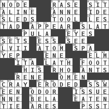 ACROSS 1. Connecting point 5. To erase 9. Be seated 12. Place in a line 14. Queen of England 1702-14 15. Binary compound 16. Bobsleighs 17. Utensil 18. French article 19. Small boy 20. Seem 23. Narrow board 24. Monetary unit of Botswana 25. Snake ____ (dice throw) 27. Arranges properly for use 30. Curvy letter 32. Perceive with the eye 33. 57 in ancient Rome 34. Smallest unit of an element 36. Health resort 38. Slangy assent 39. Compass dir. 40. Shade tree 43. Call ___ day 46. Thin strip of wood or metal 48. Pick up the tab 49. Part of HMS, perhaps 51. 17th letter of the Greek alphabet 52. Pismires 53. French philosopher Descartes 54. Presage 56. Supercomputer manufacturer 58. Eaten away 61. Compass dir. 64. Car or cant ending 65. Aroma 66. Come out of 68. Compass dir. 69. Actor Lugosi 70. Consumed 71. Standoff 72. Ancient Greek god of war 73. Inconspicuous attention getter DOWN 1. Political cartoonist Thomas 2. Rounded earthenware pot or jar 3. Passed on 4. Conclude 5. Pace 6. Small Philippine buffalo 7. Sounds asleep 8. Snakelike fish 9. Beverly of Met fame 10. The main thing one is thinking about 11. Trial 13. He sold his birthright 21. Entreaty 22. Soft color 23. Ooze 24. Air pressure measure (abbr.) 26. It is so 27. Wily 28. Night before a holiday 29. Native american tent (variation) 31. Echolocation 35. Mode 37. Age 41. Car dealer's back yard 42. Mountains (abbr.) 44. Those things 45. The 18th letter of the Arabic alphabet 47. Residence 48. Air blower 50. Sowing specialist 53. Indian princess (variant) 55. Singer Brickell 56. Penny 57. Painter Guido (1575-1642) 59. Hero or heavy, e.g. 60. Mouths or openings 61. Fast planes 62. Institutes legal proceedings 63. Gone 65. Chief or king in Benin or Nigeria 67. Plant excrement