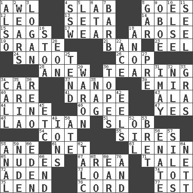 ACROSS 1. Leather borer 4. Thick slice 8. Leaves 12. Lion 13. Stalk of a moss capsule 14. Competent 15. Settles 17. Erode 18. Came up 19. Speak pompously 21. Prohibit 23. Snakelike fish 24. Snob 26. Police officer (slang) 28. Afresh 30. Pulling apart 34. Automobile 37. Billionth: prefix 39. Independent ruler or chieftain 40. "We ___ not amused" (Victoria) 41. Window treatment 43. In the manner of 44. Actor's bit 46. Double curve, resembling the letter S 47. It is so 48. Of or relating to Laos or its people 51. Messy guy 54. Small bed 55. Male parents of animals 58. One (Scot) 61. Fish or hair follower 63. Soviet premier 1918-24 65. Unadorned figures 67. Length times width 71. Lie 72. Arabian gulf 73. Grant temporary use of 74. Small child 75. Grant temporary use of 76. Drawstring 77. Eastern Standard Time (abbr.) DOWN 1. In addition 2. Puts on (as clothing) 3. Utah city north of Ogden 4. Compass dir. 5. Area sheltered from the wind 6. _ moment's notice (2 wds.) 7. Sharp remark 8. Slender fish 9. Mitch Miller's instrument 10. Otherwise 11. Stitch closed the eyes of (a falcon) 16. Portico 18. Small Philippine buffalo 20. Age 22. Adept person 25. Watch over 27. Before (prefix) 29. Make _____ (do battle with) 30. Drinks excessively 31. "If ____ say so..." 32. Mediterranean tributary 33. Pate de foie ____ 34. Give a ring to 35. Roberta Peters solo 36. Former U.S. Attorney General Janet 38. Tired old horse 42. Snakelike fish 45. And so on (abbr.) 49. Charged atoms 50. Had dinner 52. Lubricate 53. Cy Young winner Saberhagen 56. Related on the mother's side 57. Grain storage towers 58. Of or related to the anus 59. Unadorned 60. Genesis locale 62. Baby powder 64. Remaining after all deductions 66. Conclusion 68. Friend of Pooh 69. Ewer handle 70. Also