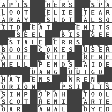 ACROSS 1. Tenement units (abbr.) 5. Possessive pronoun 9. Health resort 12. Plunder 13. Writer Wiesel 14. Pull into pieces 15. Like ___ of sunshine 16. Slit 17. In addition 18. It would 19. Consume 21. Sends forth 22. Stitch closed the eyes of (a falcon) 24. Twice 26. Unit of force equal to gravity 27. Showing deterioration from age 28. Blunders 29. Expressions of contempt or scorn 30. Popular sodas 32. One who uses or employs something 36. _ vera 37. Compete 38. French philosopher Descartes 39. 1994 drama film starring Jodie Foster 40. Depends 42. Helper 43. Mild oath, euphamism for damn 44. Money paid out 46. Floor covering 49. Followers of ems 50. Songbird 51. Constellation of myth 53. Air pressure measure (abbr.) 54. It is 57. Simple or foolish person 58. Brightly colored fish 61. Utensil 62. Native of Scotland 63. Painter Guido (1575-1642) 64. Johnson of "Laugh-In" 65. Rowing implement 66. Of or related to the anus 67. Colored DOWN 1. Jai ____ 2. Left side of a ship or aircraft 3. Inedible or poisonous agaric 4. Filthy place 5. Behest 6. Pipe bend 7. River (Sp.) 8. Put into a specified state 9. Major League Baseball Commissioner Bud 10. Thick mixture 11. Came up 14. Scottish cap 19. Snakelike fish 20. Actor Baldwin 21. Double-curved letter 23. Artist's stand 24. A special lineage 25. Big collection agency 27. Not divided or shared with others 28. Supplementing with great effort 29. Prohibit 31. Baking chambers 32. A salt of uric acid 33. Signiory (variant) 34. Inside; within (prefix) 35. Portuguese money of account (variant) 40. Baking dish 41. Sty mamas 43. Lair 45. RI univ. 46. With motion or animation 47. N. Chile seaport 48. Southeast Indonesia island 52. Choose 53. Silvers or Donahue 55. Lug 56. Downhill vehicle 58. Mouth or opening 59. Writing instrument 60. Santa ___, CA 61. Small amount or degree