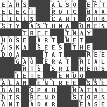 ACROSS 1. Hearing organs 5. In addition 9. Bank Draft (abbr.) 12. Opt 14. College mil. group 15. Sound made by sheep 16. Ms. Damita and namesakes 17. Draw slowly or heavily 18. Globe 19. Filthy place 20. Respiratory problem 23. Singles 24. Woody plant 25. "If ____ say so..." 27. Flexible conduit 30. Tate display 32. Fish or hair follower 33. "____ silly question..." 34. Observes 36. Definite Article 38. ___ good deed 39. Make lace 40. To riddle 43. E Mali city 46. Part of Q.E.F. 48. Monetary unit of Yemen 49. Mountains (abbr.) 51. _ Lanka 52. Possessive pronoun 53. Wig 54. Inside; within (prefix) 56. Actor Alda or Thicke 58. Main course 61. Compass dir. 64. Oblong piece of solid material 65. Brightly colored fish 66. Relating to or accompanying birth 68. Altar cloth linen 69. Former U.S. Attorney General Janet 70. Closes up, plugs up 71. Black tropical American cuckoo 72. The sixth month of the Jewish calendar 73. Comfort DOWN 1. Snakelike fish 2. Set down 3. Have trust in 4. _-fi 5. Bowlike part 6. Rich soil 7. Put through a sieve 8. Sep. follower 9. Dark wood 10. Conductor's collection 11. Bar bills 13. Russian ruler of old 21. Oceans 22. Cylindrical with tapered ends 23. Pledge 24. Afternoon social gathering 26. Was introduced to 27. Possessed 28. Bear (Spanish) 29. Heroin 31. Pulls apart 35. A viewer who gazes fixedly 37. 4th largest of the Great Lakes 41. Ewer handle 42. Raised railways 44. So be it 45. Baseball player Mel 47. Prong on a fork 48. 17th letter of the Greek alphabet 50. Oozed 53. Tarsus (plural) 55. Lairs 56. Swedish rock group 57. (Had) reclined 59. Nanny 60. Son of Odin 61. Portico 62. Plant excrements 63. Otherwise 65. Mouth or opening 67. Had dinner