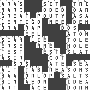 ACROSS 1. Ancient river in northeast Turkey 5. Be seated 8. Three (prefix) 11. Drug cop 12. Wrote a lyric poem 14. Rowing implement 15. Relatively large 17. Marked by pouting 18. White ___ sheet 19. Small, flat, pigmented spot on the skin 21. Born 22. Lair 23. Mouth or opening 24. Hit sharply and swiftly 25. Two (Sp.) 27. Snakelike fish 28. Smallest unit of an element 31. Thailand, formerly 35. Whopper 37. Lacquered or enameled metalware 38. Celtic language 39. Compass dir. 41. Opening into or through something 42. Trial 43. Eastern Standard Time (abbr.) 45. Narrow board 46. SW Saudi Arabia district 47. Small bed 49. Mayday 51. Had dinner 52. Ocean 55. The first octave above the treble staff 57. Keyboard key 60. Thinks logically 62. Sound made by sheep 63. Lowest deck of a ship 65. Table seasonings 66. Storage container 67. Period of immesurable duration 68. The main thing one is thinking about 69. Nonscientific branch of learning 70. Adept person 71. Dormintory (informal) DOWN 1. White American of non-Hispanic descent 2. Less widely known 3. Sports stadium 4. Go away! 5. "Barney Miller" actor Jack 6. Goddess of spring and wife of Bragi 7. Wig 8. Inedible or poisonous agaric 9. To erase 10. SW Asia republic 13. Colored 16. Become fatigued 17. Cotton for raincoats, e.g. 20. Highlander 26. Expletives 29. Water jar 30. Rendezvous 31. Bristle 32. Angers 33. Helper 34. Paris' subway 36. Compass dir. 40. Fortification 44. Carry 48. Afternoon social gatherings 50. Portico 52. Twentieth part of a lira 53. Keyboard key 54. Indian state 55. Swedish rock group 56. Den 58. Type of rug 59. Coalition 61. Stated 64. Single