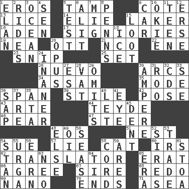 ACROSS 1. Greek god of love 5. Pack (down) 9. ____ d'Azur (French Riviera) 13. Louse (plural) 14. Writer Wiesel 15. Member of a famous L.A. basketball team 16. Arabian gulf 17. Seigniories (variant) 19. Teachers' org. 20. Baseball player Mel 21. Non-commissioned officer (abbr.) 22. Compass dir. 23. Clip 25. Arrange properly for use 26. New (sp.) 30. Curves 34. Indian state 35. Method 36. Connect, as a bridge 39. Vertical member of a panel or frame 42. Airs 43. Johnson of "Laugh-In" 44. Miss Universe 1986, Barbara Palacios _ 46. Lightbulb-shaped fruit 47. Navigate 48. Greek goddess of the dawn 51. Egg locale 54. Institute legal proceedings 57. Falsehood 58. Feline 60. Big collection agency 62. Interpreter 65. Part of Q.E.F. 66. Match 67. Father 68. Do over again 69. Billionth: prefix 70. Conclusions 71. At sea DOWN 1. Flair 2. Amusement-park features 3. Sea 4. Elected rep. 5. Trial 6. Set down 7. Russian fighter aircraft 8. Actor Sean's family 9. 4-wheeled motor vehicle 10. Migrant worker of the '30s 11. Adolescent 12. Celtic language 15. Spoils 18. Frozen water 20. Musical composition 24. Sillier 27. Curvy letter 28. Large container 29. Leaves out 30. Electrical Unit 31. Friend of Pooh 32. Music discs 33. Observe 36. Plant excrement 37. Before (prefix) 38. "One Day ___ Time" 40. Allow 41. Sight organ 45. Gouge 48. Otherwise 49. Lubricate 50. Gospel singer Marvin 52. Fathers 53. Swap 54. Comedian Laurel of Laurel & Hardy 55. Capital and largest city of Mongolia 56. Merit 58. Drawstring 59. Ancient Greek god of war 61. Portico 63. Modern: prefix 64. Shallow baking pan 65. Epoch