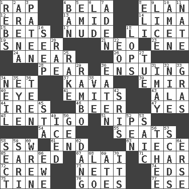 ACROSS 1. Reproach for some lapse or misdeed 4. Actor Lugosi 8. Enthusiasm 12. Epoch 13. Among 14. Pale green bean 15. Antes 17. Naked 18. It is permitted: Lat. 19. Scornful expression 21. Modern: prefix 23. Compass dir. 24. Approach 26. Elect 28. Lightbulb-shaped fruit 30. Following as a consequence or result 34. Fish or hair follower 37. Polynesian shrub of the pepper family 39. Arab leader 40. Sight organ 41. Sends forth 43. Chicken ___ king 44. Angers 46. Fermented drink made from hops 47. It is so 48. Small, flat, pigmented spot on the skin 51. Cuts off 54. Adept person 55. Theater features 58. Compass dir. 61. Conclude 63. Sibling's daughter 65. Having ears or earlike features 67. Jai _ 71. Burn to charcoal 72. Ship's personnel 73. Remaining after all deductions 74. Begley and Asner 75. Prong on a fork 76. Travels 77. Compass dir. DOWN 1. Confederate soldiers (slang) 2. Sports stadium 3. Eucharist need 4. Bar 5. Australian flightless bird 6. Hat (slang) 7. Arabian gulf 8. Connecticut Ivy Leaguer 9. Louse (plural) 10. So be it 11. Nathan's nickname 16. Ooze 18. Chops off 20. Actress Charlotte 22. A really long time 25. Immoral or dissolute person 27. Third day of the wk. 29. Role for Stallone 30. Eroded 31. "If ____ say so..." 32. "Death on the ____" 33. Pate de foie ____ 34. Famous astronaut Armstrong 35. Jane of fiction 36. Adolescent 38. Compete 42. Indian titles of respect 45. R.R. building 49. On the rocks 50. Commissioned military rank (abbr.) 52. Writing instrument 53. Ketch in the Levant 56. Giggle 57. Heaps 58. Religious group 59. Indian skirt 60. Songbird 62. Mild oath, euphamism for damn 64. Celtic language 66. She-sheep 68. Lion 69. Had dinner 70. ___ a Wonderful Life