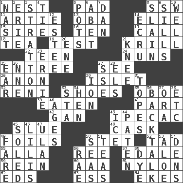 ACROSS 1. Egg locale 5. Writing tablet 8. Compass dir. 11. Nick name for Arthur 13. Chief or king in Benin or Nigeria 14. Writer Wiesel 15. Fathers 16. "___ Little Indians" 17. Give a ring to 18. Beverage made from leaves 19. Trial 21. Shrimp-like planktonic crustaceans 22. Adolescent 24. Religious women 25. Main course 27. Observe 29. At once, immediately (arch.) 30. Small island 32. Painter Guido (1575-1642) 33. Imelda's hoard 35. Mitch Miller's instrument 39. Consumed 41. Piece 42. Separate the seeds from cotton 43. Medicinal drug used to evoke vomiting 45. Change direction abruptly 48. Keg 49. Fencing necessities 50. Proofreading order 52. Small boy 55. Silent film actress Nazimova 56. To sift 57. Peak District village in England 59. It's straight from the horse's mouth 60. American Automobile Association (abbr.) 61. Thermoplastic polyamide 62. Begley and Asner 63. Curvy letter 64. Supplements with great effort DOWN 1. Political cartoonist Thomas 2. One of the Great Lakes 3. Ski resort town in Vermont 4. Standoff 5. Cooking vessels 6. Collude with 7. One of the 12 tribes of Israel 8. Killed 9. Beverly of Met fame 10. Not ill 12. First name in cosmetics 14. Shade of tan 20. Compass dir. 21. Leg joint 23. Bert's buddy 25. Hearing organ 26. Compass dir. 27. Compass dir. 28. Raised railways 30. Electrically charged atom 31. Drinks excessively 33. R.R. building 34. Layer 36. Sass 37. Mouth or opening 38. And so on (abbr.) 40. Grows older 43. Frozen water 44. Eucharist need 45. Having a sole or soles 46. Ms. Damita and namesakes 47. Uhlan (variant) 49. Conductor's collection 50. Oceans 51. Beverages made from leaves 53. Medicinal plant 54. Habitations of wild animals 56. Actress Charlotte 58. Color