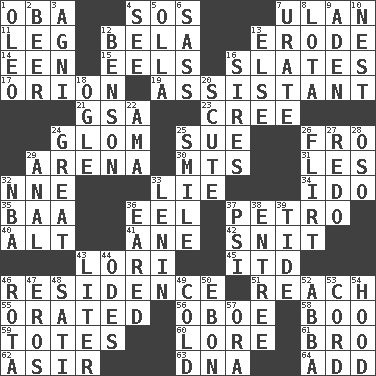 ACROSS 1. Chief or king in Benin or Nigeria 4. Mayday 7. ____ Bator, Mongolia 11. Part of a journey 12. Actor Lugosi 13. Wear away 14. Car or cant ending 15. Snakelike fish 16. Chalkboards 17. Constellation of myth 19. Helper 21. Girls' org. (abbr.) 23. Algonquian 24. Seize upon or latch onto something 25. Take to court 26. Back 29. Sports stadium 30. Mountains (abbr.) 31. French article 32. Compass dir. 33. Falsehood 34. Wedding promise 35. Sound made by sheep 36. Snakelike fish 37. Stone: prefix 40. The first octave above the treble staff 41. A saturated hydrocarbon 42. In a ____ (agitated or irritated) 43. Australian parrot (variant) 45. It would 46. Dwelling 51. Arrive at 55. Spoke pompously 56. Mitch Miller's instrument 58. Sometimes accompanies a hiss 59. Hauls 60. Old wives' tales, e.g. 61. Sis' sibling 62. SW Saudi Arabia district 63. Heredity factor (abbr.) 64. Say or write further DOWN 1. Margarine 2. Fermented drink made from hops 3. Hindu god of fire 4. Perceive with the eye 5. Water jar 6. Backtalk 7. A salt of uric acid 8. Globular water bottle used in Asia 9. Arabian gulf 10. A home for chicks 12. Gillaume's butler role 13. Otherwise 16. Fathers 18. Stare at amorously 20. Turtle shell scale 22. Housemaid (var.) 24. Relatively large 25. Grin 26. Seductive woman who exploits men 27. Do over again 28. Bear (Spanish) 29. Of or related to the anus 32. Basketball assoc. 33. Soviet premier 1918-24 36. Having ears or earlike features 37. 23rd letter of the Greek alphabet 38. Main course 39. Event that recurs at intervals 43. 61 cubic inches 44. Lyric poems 46. Roll call or roster of names 47. Greek god of love 48. Suttee (variant) 49. Chilled 50. Inky black, to poets 52. Swedish rock group 53. Drawstring 54. Parka part 57. Mouth or opening