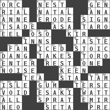 ACROSS 1. The grampus (Milton) 4. Egg locale 8. Commissioned military rank (abbr.) 11. Monetary unit of Yemen 13. Relating to or accompanying birth 15. Santa ___, CA 16. Singer Murray 17. Wear away 18. Attach a signature 19. Sadhe (variant) 21. White ___ sheet 22. Pacific island yam 23. Snakelike fish 24. Bear (Spanish) 27. Apertif with cassis 29. Restaurants 30. Clothes sense 34. Avid follower 36. On the rocks 39. Unemotional 40. Mild oath, euphamism for damn 41. Proceeds 43. "Corrida" creature 44. Keyboard key 46. Respite 47. Single 48. Annoying sound 49. Peachy ____! 51. Beverage made from leaves 53. R.R. building 54. Scottish cap 57. Small island 60. Chewing product 63. Laconic 65. Lacking any legal or binding force 66. 1973 Nobel Price Winner (Physics) Leo 69. Electrical Unit 70. 100% 71. Small fatty European fish 72. Arab leader 73. Modern: prefix 74. Stalk of a moss capsule 75. Before (prefix) DOWN 1. Speak pompously 2. Wash lightly 3. Lessep's creation 4. Compass dir. 5. Ewer handle 6. Portico 7. Bits 8. Greek goddess of the earth (variant) 9. Engineer (abbr.) 10. Billionth: prefix 12. Directed 14. Path through which fluid escapes 18. Ski resort town in Vermont 20. A really long time 25. In a ____ (agitated or irritated) 26. Witty Wilde 28. It is 29. Swallowed 31. Within a short period 32. Hoop that covers a wheel 33. Environmental prefix 34. Papal veil 35. Opposed to 37. Supplement with great effort 38. Writing tables 40. Lair 42. Proofreading order 45. Portuguese money of account (variant) 50. Ingest 52. Ripens 54. _____ steamer (cargo ship) 55. Moving or stirring 56. Distance measurement (Brit.) 57. "Terrible" tsar 58. Not divided or shared with others 59. _ and Stitch 61. United States Postal Service (abbr.) 62. Female horse 64. She-sheep 67. Krazy ___ of comics 68. Call ___ day