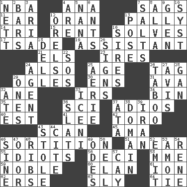 ACROSS 1. Basketball assoc. 4. Santa ___, CA 7. Sinks 11. Ewer handle 12. NW Algerian seaport 13. Chummy 14. Three (prefix) 15. Monthly bill 16. Finds the solution 17. Sadhe (variant) 19. Aide 21. Raised railways 23. Angers 24. In addition 25. Personal question 26. Label 29. Stares at amorously 30. Followers of ems 31. Actress Gardner 32. One (Scot) 33. Big collection agency 34. Storage container 35. "___ Little Indians" 36. _-fi 37. Goodbye (Sp.) 40. Eastern Standard Time (abbr.) 41. Area sheltered from the wind 42. "Corrida" creature 43. Examine hastily 45. Nursemaid (var.) 46. Drawing lots 51. Approach 55. Foolish or stupid persons 56. Tenth: prefix 58. Madame (abbr.) 59. Having high moral qualities 60. Liveliness 61. Electrically charged atom 62. Celtic language 63. Mischievous 64. Standoff DOWN 1. Remaining after all deductions 2. Soap units 3. Roberta Peters solo 4. "We ___ not amused" (Victoria) 5. Grandmother 6. Pismires 7. Table seasonings 8. Inventor's middle name 9. Small, secluded valley 10. System (abbr.) 12. Threatening words 13. Airs 16. Male parents of animals 18. Small valley 20. Public displays of written messages 22. Distress signal 24. Representative 25. Nest on high 26. Off limits 27. Deliberation 28. Separate the seeds from cotton 29. Singles 32. Had dinner 33. Ancient Celtic tribe of eastern Britain 36. Narrow boards 37. _ moment's notice (2 wds.) 38. Realm 39. SW Asia republic 43. Took without asking 44. Quote 46. Trig term 47. Scent 48. Teases 49. Lyric poems 50. 1994 drama film starring Jodie Foster 52. Give off 53. Mine, in Marseilles 54. French philosopher Descartes 57. Island