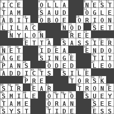 ACROSS 1. Frozen water 4. Rounded earthenware pot or jar 8. A home for chicks 12. Scottish cap 13. Saudi Arabian king (1953-1964) 14. Stare at amorously 15. "This won't hurt ____!" 17. Mitch Miller's instrument 18. Constellation of myth 19. Pale purple color 21. Allow head to fall sleepily 23. Arrange properly for use 24. Thermoplastic polyamide 26. To sift 28. Singer James 30. More disrespectful 34. Fish or hair follower 37. It may be bright or harebrained 39. Inside; within (prefix) 40. Personal question 41. Scorch 43. Teat (slang) 44. Zero-star reviews 46. Wrote a lyric poem 47. Lion 48. Inveterate users 51. Drop; flow; fall 54. Before (prefix) 55. Cod relative 58. Title for a knight 61. Ewer handle 63. Marketplace scale 65. Grin 67. Von Bismarck 71. Chop _ 72. Not wild 73. NW Algerian seaport 74. Perceive with the eye 75. System (abbr.) 76. Periodic rise and fall of the sea level 77. Curvy letter DOWN 1. Slanted text style (abbr.) 2. Small house or cottage 3. Poet Dickinson 4. Bear (Spanish) 5. Experiment locale 6. Nilotic language 7. Arabian gulf 8. Or not 9. The front part of a cuirass 10. A type of plum 11. Portable shelter 16. Story 18. Lyric poems 20. Small bed 22. Mouth or opening 25. Nuclear Threat Initiatives 27. Compass dir. 29. Goodbye (Sp.) 30. Gurus 31. International (abbr.) 32. Singer Brickell 33. Printing process, for short 34. California wine valley 35. Mild oath 36. Be inclined (to) 38. Conclude 42. Prepare for publication 45. Small drink 49. Algonquian 50. Beverage made from leaves 52. Car dealer's back yard 53. Blunders 56. Boozer 57. Leg joints 58. Fast planes 59. "If ____ say so..." 60. Basketball hoops 62. Carrot, for example 64. Sight organs 66. Allow 68. Three (prefix) 69. Small boy 70. Single