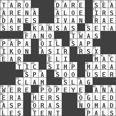 ACROSS 1. Edible starchy tuberous root 5. Have the gumption 9. Ocean 12. Sports stadium 14. Medicinal plant 15. Big collection agency 16. Natives or inhabitants of Denmark 17. "Terrible" tsar 18. Actress Charlotte 19. Compass dir. 20. Sunflower state 23. Stalk of a moss capsule 24. Papal veil 25. It was, poetically 27. Dad 30. Lubricate 32. Plant excrement 33. Image 34. SW Saudi Arabia district 36. Acura sports coupe 38. Ewer handle 39. Connecticut Ivy Leaguer 40. Apple computer (short form) 43. Nervous spasm 46. Simple or foolish person 48. Hindu Mythology: god of death 49. Health resort 51. "Barney Miller" actor Jack 52. One who uses or employs something 53. Dollar (slang) 54. Volcanic refuse 56. We are 58. Wimpy's pal 61. Santa ___, CA 64. Epoch 65. Possessive pronoun 66. Stared at amorously 68. Cleo's killer 69. Mouths or openings 70. Roamer 71. French article 72. Portable shelter 73. Friends DOWN 1. Bits 2. Caspian sea tributary 3. French philosopher Descartes 4. Single 5. Raised platform 6. Inventor's middle name 7. Cooks with dry heat, as in an oven 8. Car or cant ending 9. Founders of families 10. Part of Q.E.F. 11. Toward the sea 13. "____ silly question..." 21. Small Philippine buffalo 22. Annoying sounds 23. Plant excrements 24. Avid follower 26. Armed conflict 27. Sliced dessert 28. Alias (abbr.) 29. Left side of a ship or aircraft 31. Ms. Damita and namesakes 35. Full of chinks, cracks, or crevices 37. Dec. holiday 41. "We ___ not amused" (Victoria) 42. Automobile 44. Capri or Wright 45. Tax preparer (abbr.) 47. Many (prefix) 48. Java container 50. Electrical Unit 53. Dice game 55. Period of immesurable duration 56. Welt 57. Celtic language 59. Northwest Algerian city 60. Inconspicuous attention getter 61. _ mater 62. Be tempered by heat 63. Does sums 65. Being at a high temperature 67. Republican Party