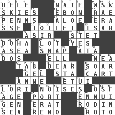 ACROSS 1. Ubangi River tributary 5. Nathan's nickname 9. Compass dir. 12. Atmospheres 14. Inky black, to poets 15. Actress Charlotte 16. Actor Sean's family 17. _ vera 18. Epoch 19. Compass dir. 20. Bathroom 23. Russian ruler of old 24. SW Saudi Arabia district 25. Proofreading order 27. Capital of the state of Qatar 30. Car dealer's back yard 32. Affirmative reply 33. Toward the sea 34. Fastener 36. "One Day ___ Time" 38. Two (Sp.) 39. Pipe bend 40. Teachers' org. 43. Bar bill 46. Letter starter 48. Fly high 49. Set 51. R.R. building 52. Haul 53. Singer Murray 54. Needle case 56. Australian parrot (variant) 58. Annoying sounds 61. Order of Saint Francis (abbr.) 64. Ripen 65. Sweet dark-red dessert wine 66. World-weariness 68. Commissioned mil. rank 69. Part of Q.E.F. 70. "The Thinker" sculptor 71. Ocean 72. Western Nevada city 73. Printing process, for short DOWN 1. United States Postal Service (abbr.) 2. Makes supply last 3. Actor's bit 4. Car or cant ending 5. Actress Patricia 6. Competent 7. Tootsie (variant) 8. Compass dir. 9. Take or capture by force 10. "Two Mules for Sister ____" 11. Put on (as clothing) 13. Fast planes 21. Petroleums 22. Pressed 23. Trial 24. Auto club (abbr.) 26. Afternoon social gathering 27. Male parent 28. Bear (Spanish) 29. Command 31. Falsehoods 35. Food holders 37. Small Philippine buffalo 41. Ewer handle 42. Tate display 44. Hindu god of fire 45. Benjamin's nick name 47. Assign a rank or rating to 48. _-fi 50. Poe poem 53. Sports stadium 55. One who uses or employs something 56. Fails to keep up a pace 57. Double curve, resembling the letter S 59. NW Algerian seaport 60. "Tell ____ the Marines!" 61. Southwest Nigerian state 62. Set or collection 63. Fine (Spanish) 65. For each 67. And not