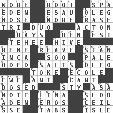 ACROSS 1. Had on 5. Carrot, for example 9. Health resort 12. Locale of original sin 13. He sold his birthright 14. Cassini of fashion 15. Sense of smell 16. Greater amount 17. To erase 18. Three (prefix) 19. Superhero pair 21. Gambison 22. 24-hour periods 24. Lair 26. Eastern Standard Time (abbr.) 27. Giggle 28. Hub of activity 29. French philosopher Descartes 30. Rob, plunder, or pillage 32. Comedian Laurel of Laurel & Hardy 36. South American Indian 37. "Barney Miller" actor Jack 38. Diluted with white 39. Wrote a lyric poem 40. Table seasonings 42. Margarine 43. Casino tip 44. Learning spot: Fr. 46. She-sheep 49. Black tropical American cuckoo 50. Patter 51. Administered medicine 53. Filthy place 54. White ___ sheet 57. Short letter 58. Pale green bean 61. Messy guy 62. An important port of Yemen 63. Greek god of love 64. To provide with a ceiling 65. Compass dir. 66. Bar bills 67. Small island DOWN 1. Gone 2. Aroma 3. Home 4. Compass dir. 5. San ____ (Riviera town) 6. Bear (Spanish) 7. Boat paddle 8. Third day of the wk. 9. Chalkboard 10. Mexican monetary units 11. Representative 14. The grampus (Milton) 19. Color 20. One who uses or employs something 21. One (Scot) 23. Forward in time 24. A piece of turf (Scot.) 25. First lady 27. Watch over 28. White Person, in Hawaii 29. _ de Janeiro 31. 1973 Nobel Price Winner (Physics) Leo 32. Soup utensil 33. Baron Munchausen's specialties 34. Toward shelter 35. Modern: prefix 40. Male child 41. Religious group 43. Bit 45. Island 46. Ferber et al. 47. Forest 48. First name in cosmetics 52. Car or cant ending 53. Backtalk 55. Earth 56. Competent 58. Allow 59. Lyricist Gershwin 60. Crowd into 61. _-fi