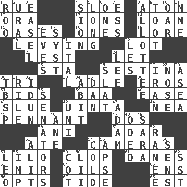 ACROSS 1. Sorrow 4. A type of plum 8. Tiny particle 12. Mouth or opening 13. Charged particles 14. Rich soil 15. Fertile tracts in a desert 18. Washington bills 19. Old wives' tales, e.g. 20. Imposing or collecting, as a tax 22. Car dealer's back yard 23. For fear that 24. Allow 25. R.R. building 26. French poetic form 30. Three (prefix) 33. Dipping utensil 36. Greek god of love 37. Auction offers 39. Sound made by sheep 40. Relaxation 41. Change direction abruptly 42. National forest in Provo, Utah 44. Teachers' org. 45. Pre-World Series prize 47. Two (Sp.) 50. Black tropical American cuckoo 51. The sixth month of the Jewish calendar 53. Had dinner 54. Devices for capturing images 57. _ and Stitch 59. Hoof sound 61. Natives or inhabitants of Denmark 63. Independent ruler or chieftain 64. Lubricates 65. Followers of ems 66. Chooses 67. Periodic rise and fall of the sea level 68. Eastern Standard Time (abbr.) DOWN 1. Friend of Pooh 2. Mountain range 3. Artist's stand 4. The Jewish people; Israel 5. Yearn 6. Single 7. Double-curved letter 8. One to whom something is allotted 9. A blast of a horn 10. Boat paddle 11. Madame (abbr.) 16. Nights before holidays 17. System (abbr.) 21. Slanted text style (abbr.) 22. French article 24. Area sheltered from the wind 26. Narrow board 27. SW Asia republic 28. Characteristic smell of wine 29. Toward the sea 30. Cook's measure (abbr.) 31. Cause heat under the collar 32. Goddess of spring and wife of Bragi 34. "This won't hurt ____!" 35. One of the 12 tribes of Israel 38. Legislators 42. Single; one (prefix) 43. First of billions? 46. One (Scot) 48. Wrote a lyric poem 49. "Two Mules for Sister ____" 52. Indian princess (variant) 53. Came down and settled, as after flight 54. Lacking warmth 55. Domed church section 56. Elected reps. 57. Lion 58. Mischievous child 59. Small bed 60. Cards in a Roman deck? 62. Fast jet (abbr.)