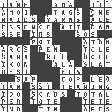 ACROSS 1. Hyperbolic tangent 5. Housemaid (var.) 8. Teat (slang) 11. Mine, in Marseilles 12. Labels 14. Single 15. Women servants 17. Tall tales 18. Adept person 19. Substance 21. Small island 22. Daniel's nick name 23. Compass dir. 24. Big collection agency 25. Distress signal 27. Cooking vessel 28. Smallest unit of an element 31. Curves 35. Animal enclosure 37. Lacquered or enameled metalware 38. "Two Mules for Sister ____" 39. To sift 41. Opening into or through something 42. Picture 43. Wing 45. Narrow board 46. Repose 47. Raised railways 49. Plant excrement 51. Police officer (slang) 52. Lion 55. The 23rd letter of the Hebrew alphabet 57. Fast jet (abbr.) 60. Separating forcefully 62. Wedding promise 63. Tons 65. Add up to 66. For each 67. Lug 68. Wig 69. Indiana (abbr.) 70. Shallow baking pan 71. Ancient Greek god of war DOWN 1. Corrects by punishment or discipline 2. Collect or gather 3. Annoying sound 4. Flintstone garb 5. _ moment's notice (2 wds.) 6. Hindu Mythology: god of death 7. Hindu god of fire 8. Inedible or poisonous agaric 9. South American Indian 10. Adolescent 13. Fast planes 16. Clip 17. Of or pertaining to yesterday 20. Riding implement 26. Expletives 29. Spanish pot 30. Rendezvous 31. SW Saudi Arabia district 32. Immoral or dissolute person 33. What you're doing now 34. Before Barbara or Clara 36. Teachers' org. 40. Opts 44. _ vera 48. Petty quarrel 50. Inconspicuous attention getter 52. 61 cubic inches 53. Related on the mother's side 54. Stares at amorously 55. Native american tent (variation) 56. An important port of Yemen 58. Highlander 59. Jacques of French films 61. Round or rotation of duties 64. Lair