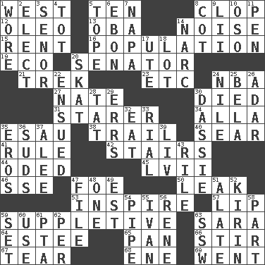 ACROSS 1. 270 degrees 5. "___ Little Indians" 8. Hoof sound 12. Margarine 13. Chief or king in Benin or Nigeria 14. Annoying sound 15. Monthly bill 16. Census information 19. Environmental prefix 20. Elected representative 21. Long journey 23. And so on (abbr.) 24. Basketball assoc. 27. Nathan's nickname 30. Passed on 31. A viewer who gazes fixedly 34. Silent film actress Nazimova 35. Son of Isaac 38. Go after with the intent to catch 40. Shrivel 41. Governing power 42. Flight of steps 44. Wrote a lyric poem 45. 57 in ancient Rome 46. Compass dir. 47. Enemy 50. Path through which fluid escapes 53. Stimulate to action 57. Mouth edge 59. Supplying deficiencies 63. "Two Mules for Sister ____" 64. First name in cosmetics 65. Baking dish 66. Disorderly outburst 67. Lacerate 68. Compass dir. 69. Left DOWN 1. Had on 2. Choose 3. Sir (Sp.) 4. Small child 5. Drink excessively 6. Inky black, to poets 7. California wine valley 8. Small bed 9. Cards in a Roman deck? 10. Bear (Spanish) 11. Animal enclosure 14. Drug cop 17. Shoshoni 18. Car dealer's back yard 20. Three-handed card game 22. Followed as a consequence or result 24. "Death on the ____" 25. Actor Lugosi 26. The sixth month of the Jewish calendar 28. Make lace 29. Blunders 30. Small ungulate mammals of Africa 32. Consume 33. Monetary unit of Yemen 35. Greek god of love 36. Soap bubbles 37. Toward shelter 39. 54 in ancient Rome 43. Cause heat under the collar 47. Do some clerical work 48. Single 49. Eastern Standard Time (abbr.) 51. Having winglike extensions 52. Japanese brewing company 54. Corncob 55. "Terrible" tsar 56. French philosopher Descartes 58. Piece 59. Arrange properly for use 60. Purpose 61. Parent Teacher Association (abbr.) 62. For each 63. Compass dir.