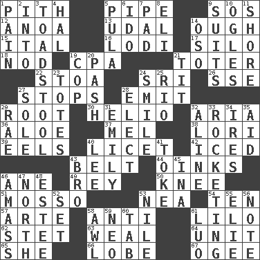 ACROSS 1. Heart or essence 5. Corncob 9. Distress signal 12. Small Philippine buffalo 13. Hereditary estate 14. Ending for "Through" and "Enough" 15. Slanted text style (abbr.) 16. Farming town in central California 17. Grain storage tower 18. Dreamland 19. Numbers guy (abbr.) 21. Carrier 22. Portico 24. Indian title of respect (Mr.) 26. Compass dir. 27. Closes up, plugs up 28. Send forth 29. Carrot, for example 30. Sun: prefix 32. Roberta Peters solo 36. _ vera 37. Cartoonist voice _ Blanc 38. Australian parrot (variant) 39. Snakelike fish 40. It is permitted: Lat. 42. On the rocks 43. Waist strap 44. Pig sounds 46. One (Scot) 49. Marina Del _, California 50. Leg joint 51. With motion or animation 53. Teachers' org. 54. Nine, plus one 57. Johnson of "Laugh-In" 58. Against 61. _ and Stitch 62. Proofreading order 63. Welt 64. A single undivided whole 65. A female animal or person 66. Ear part 67. Double curve, resembling the letter S DOWN 1. Ache 2. To the inside or interior of 3. Inedible or poisonous agaric 4. Actor Linden 5. Monetary unit of Botswana 6. Wedding promise 7. Writing tablet 8. Connecticut Ivy Leaguer 9. Costumes for special activities 10. Stares 11. Dinah or Pauly 14. Bear (Spanish) 19. Police officer (slang) 20. Romantic infatuation 21. Teat (slang) 23. Hauls 24. Grin 25. River (Sp.) 27. Not divided or shared with others 28. Opt 29. Actress Charlotte 31. Poet Dickinson 32. Place in a line 33. Shooting up abruptly 34. Angers 35. Assist 40. Area sheltered from the wind 41. Puff or smoke 43. Sis' sibling 45. _ tizzy (2 wds.) 46. Collect or gather 47. Compass direction 48. First name in cosmetics 52. Put into a specified state 53. "Death on the ____" 55. Writer Wiesel 56. Observe 58. Leather borer 59. Modern: prefix 60. Keyboard key 61. Nilotic language