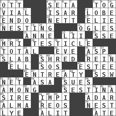 ACROSS 1. Baseball player Mel 4. Bristle 8. Coat; cloak 11. Small bottle 13. Austrian river, tributary to the Danube 14. Ear part 15. Inside; within (prefix) 16. Remaining after all deductions 17. Writer Wiesel 18. Snuggling 21. Stares 22. Singer Murray 23. Cards in a Roman deck? 25. Compass dir. 26. Medical imaging device (abbr.) 29. A testis 32. Add up to 34. First lady 35. Viper 38. Thick slice 39. Tear up 41. It's straight from the horse's mouth 43. Pipe bend 44. Distress signal 45. First name in cosmetics 46. Plea 50. Compass dir. 51. Fish or hair follower 54. White ___ sheet 55. Takes to court 57. Amid 59. French poetic form 63. The founder of a family 64. Body of Kaffir warriors 67. The sixth month of the Jewish calendar 68. _ mater 69. Vintage cars 70. A home for chicks 71. Potassium hydroxide 72. Came down and settled, as after flight 73. Had dinner DOWN 1. Baking chamber 2. Prong on a fork 3. Bits 4. Burns superficially 5. Compass dir. 6. Make lace 7. Nonscientific branch of learning 8. For Whom the Bell _____ 9. Off-Broadway awards 10. Honkers 12. Globular water bottle used in Asia 14. Part of a journey 19. International (abbr.) 20. Compass dir. 21. Lubricate 23. Moving, as bait 24. On the rocks 26. Mountains (abbr.) 27. Hero or heavy, e.g. 28. Slanted text style (abbr.) 30. Laconic 31. Hearing organs 33. Competent 36. Arranges properly for use 37. Sliced desserts 39. Fast planes 40. Israeli folk dance 42. ___ Haven, CT 45. Sight organs 47. Tired old horse 48. Aid 49. Third day of the wk. 51. Relating to the nose 52. Poet Dickinson 53. Singer Mel 56. Comedian Laurel of Laurel & Hardy 58. Teachers' org. 60. It may be bright or harebrained 61. Political cartoonist Thomas 62. Johnson of "Laugh-In" 64. Retirement account (abbr.) 65. Cartoonist voice _ Blanc 66. Luau course
