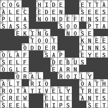 ACROSS 1. Gear tooth 4. Flintstone garb 8. Singer James 12. Actor Baldwin 14. Genesis locale 15. Observes 16. Entreaty 17. Unrelated to defense, as in spending 20. Backtalk 21. "Barney Miller" actor Jack 22. Parent Teacher Assoc. 23. Supplementing with great effort 27. Olfactory organ 29. A blast of a horn 31. Leg joint 34. More peculiar 35. Restaurants 36. Norwegian king 39. Plant excrement 41. Sight organs 42. Automatically 43. Alight from a bus 46. Stare at amorously 47. Merit 48. Taken by mouth 51. Agitated, as a liquid 54. The first octave above the treble staff 56. River (Sp.) 58. Pledge 61. Happening in regular succession 66. Woody plant 67. Ship's personnel 68. Writer Wiesel 69. Pismires 70. Sew up the eyelids of hawks and falcons 71. Cuts off 72. Arrange properly for use DOWN 1. Smile enhancers 2. Water jar 3. Honkers 4. Layer 5. Wedding promise 6. Lair 7. Conclusions 8. Compass dir. 9. 3-inch nail 10. Trial 11. At sea 13. Keg 18. A really long time 19. Egg _ yung 24. It would 25. Lower and raise head in agreement 26. Leaves 28. Atmospheres 30. Exchange 32. Compass dir. 33. Curvy letter 34. Auction bid 36. Bear (Spanish) 37. Part of a journey 38. One to whom something is allotted 40. Lightbulb-shaped fruit 44. Sis' sibling 45. University (slang) 49. Tate display 50. Cards in a Roman deck? 52. Globular water bottle used in Asia 53. Tall tales 54. Arches 55. Old wives' tales, e.g. 57. Baking chamber 59. False hair 60. Command 62. Leather borer 63. Biblical high priest 64. Mouth edge 65. Affirmative reply