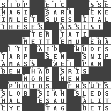 ACROSS 1. Halt 5. And so on (abbr.) 8. Compass dir. 11. Wise men 12. "Two Mules for Sister ____" 14. Make supply last 15. An arm off of a larger body of water 17. Institutes legal proceedings 18. Slanted text style (abbr.) 19. College papers 21. Aid 23. "___ Little Indians" 25. Jacques of French films 26. Remaining after all deductions 27. Australian flightless bird 28. Period 31. Cards in a Roman deck? 33. Assist 35. Unclothed pictures 37. Canvas cover 38. Elected rep. 40. Sever or remove by pinching or nipping 41. Collect or gather 43. Dripping 45. Baking dish 46. Benjamin's nick name 47. Possessed 50. Indian titles of respect 52. Greater amount 53. Layer 54. Pictures 56. Follows as a consequence or result 61. Oscar Madison type 62. Thailand, formerly 65. Bobsleighs 66. Actor Linden 67. Son of Isaac 68. Set down 69. Sight organ 70. Label 71. Stakes DOWN 1. Stricken, poetically 2. Hyperbolic tangent 3. Stare 4. Sliced desserts 5. Curvy letter 6. The 19th letter of the Greek alphabet 7. Cause to be 8. Arranges properly for use 9. Three-handed card game 10. Snakelike fish 13. Indian state 16. Wig 18. One more than two 20. Bristle 22. Make senseless or dizzy 24. Nuclear Threat Initiatives 26. Cuts off 28. Pulitzer Prize-winning author Ferber 29. It's straight from the horse's mouth 30. Viper 31. Unable to walk 32. SW Asia republic 34. Morning condensation 36. United States Postal Service (abbr.) 37. Keyboard key 39. Tender 42. Attempt 44. Woody plant 48. Came up 49. Stop 51. Lodging establishments 52. Crowd into 54. Frolic 55. Hollow 57. Broad, flat, thick piece 58. Ubangi River tributary 59. Prepare for publication 60. Fast planes 61. A female animal or person 63. Auto club (abbr.) 64. Java container