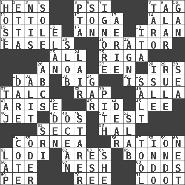 ACROSS 1. Coop moms 5. Air pressure measure (abbr.) 8. Label 11. Von Bismarck 12. Ancient Roman robe 14. Insect wing 15. Vertical member of a panel or frame 17. Singer Murray 18. SW Asia republic 19. Artist's stands 21. Speaker 23. Everything 25. Port city in Latvia 26. Small Philippine buffalo 27. Car or cant ending 28. Big collection agency 31. Small moist lump or mass 33. Large 35. Come out of 37. Baby powder 38. Strike 40. Silent film actress Nazimova 41. Get up 43. To free from 45. Area sheltered from the wind 46. Passenger plane 47. Two (Sp.) 50. Trial 52. Religious group 53. Actor Linden 54. Pupil covering 56. Food allowance for one day 61. Farming town in central California 62. Ancient Greek god of war 65. Child's nurse 66. Had dinner 67. Delicate 68. Likelihood 69. For each 70. To sift 71. Plunder DOWN 1. Stockings 2. Singer James 3. Nuclear Threat Initiatives 4. Flatfish 5. Parent Teacher Association (abbr.) 6. Male child 7. Disregard 8. Pacific island yam 9. Having or resembling wings 10. Separate the seeds from cotton 13. Nest on high 16. Enthusiasm 18. Call ___ day 20. Messy guy 22. Hindu god of fire 24. Den 26. Lettered men learn these first 28. Small island 29. Governing power 30. Ocean 31. Have the gumption 32. Set down 34. Slender fish 36. Table seasoning 37. _ Mahal 39. Heart or essence 42. Genesis locale 44. Letter starter 48. Sea 49. A viewer who gazes fixedly 51. Thick slice 52. Indian title of respect (Mr.) 54. ____ d'Azur (French Riviera) 55. River in Europe 57. Implement 58. Southeast Asian peninsula 59. Southwest Nigerian state 60. A home for chicks 61. Infant locale 63. Compass dir. 64. A female animal or person