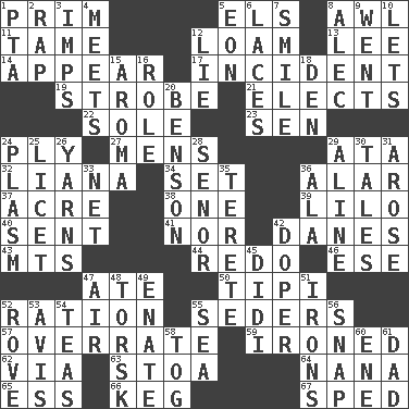 ACROSS 1. Demure 5. Raised railways 8. Leather borer 11. Not wild 12. Rich soil 13. Area sheltered from the wind 14. Seem 17. Event 19. Disco prop 21. Chooses 22. Not divided or shared with others 23. Elected rep. 24. Apply oneself diligently 27. Not women's 29. _ moment's notice (2 wds.) 32. Woody, climbing, usually tropical plant 34. Put into a specified state 36. Having or resembling wings 37. Measure of real estate 38. Single 39. _ and Stitch 40. Emitted 41. Not either 42. Natives or inhabitants of Denmark 43. Mountains (abbr.) 44. Make new 46. Compass dir. 47. Had dinner 50. Native american tent (variation) 52. Food allowance for one day 55. Spring feasts 57. Make much ado about nothing 59. Pressed 62. By way of 63. Portico 64. Nanny 65. Curvy letter 66. Cask 67. Drove too fast DOWN 1. Parent Teacher Association (abbr.) 2. Strike 3. Naughty children 4. Confronts 5. Age 6. Shoestrings 7. Grin 8. Actor Baldwin 9. Left 10. Allows 12. Untruth 15. Scent 16. Hero or heavy, e.g. 18. Lair 20. Gillaume's butler role 24. Suffix with ecto or cyto 25. It is permitted: Lat. 26. Tall tales 28. Sir (Sp.) 29. Place in a line 30. Falsehoods 31. Came up 33. Fish or hair follower 35. Cylindrical with tapered ends 36. In the manner of 42. Drug addict 45. "You Light Up My Life" star Conn 47. Atmosphere 48. Cod relative 49. Related on the mother's side 51. Metal shackles 52. Be footloose 53. Advice 54. Afternoon social gatherings 55. Ocean 56. Fastener 58. Coat; cloak 60. Compass dir. 61. Male parent
