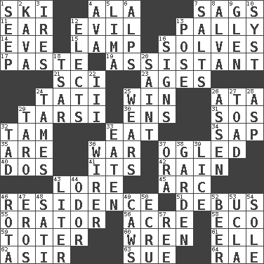 ACROSS 1. What Jean-Claude Killy likes to do 4. According to 7. Settles 11. Ewer handle 12. Morally bad or wrong 13. Friendly 14. First lady 15. Desk light 16. Finds the solution 17. Thick mixture 19. Helper 21. _-fi 23. Eons 24. Jacques of French films 25. Acquire through effort 26. _ moment's notice (2 wds.) 29. Tarsus (plural) 30. Followers of ems 31. Mayday 32. Scottish cap 33. Ingest 34. Plant excrement 35. "We ___ not amused" (Victoria) 36. Armed conflict 37. Stared at amorously 40. Two (Sp.) 41. ___ a Wonderful Life 42. Water falling in drops from the sky 43. Old wives' tales, e.g. 45. Curve 46. Dwelling 51. To get out of a bus 55. Speaker 56. 1/640 square mile 58. Environmental prefix 59. Carrier 60. Songbird 61. Pipe bend 62. SW Saudi Arabia district 63. Take to court 64. Actress Charlotte DOWN 1. Ooze 2. Polynesian shrub of the pepper family 3. Angers 4. Actress Gardner 5. Pale green bean 6. High mountains 7. Table seasonings 8. Inventor's middle name 9. Small, secluded valley 10. System (abbr.) 12. Opts 13. Airs 16. Public displays of written messages 18. Russian ruler of old 20. Inhabitant of Heaven 22. One more than two 24. Softens 25. Puts on (as clothing) 26. NE Netherlands city 27. Frog relative 28. Viper 29. Pacific island yam 32. Bit 33. Ingested 36. One who wires 37. Mouth or opening 38. Place where plants grow 39. Louse (plural) 43. 61 cubic inches 44. Aroma 46. Roll call or roster of names 47. Greek god of love 48. Suttee (variant) 49. Crow sounds 50. Shade of tan 52. Fermented drink made from hops 53. Southern CA. univ. 54. Flatfish 57. To sift