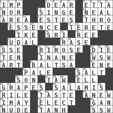 ACROSS 1. Naughty child 4. Letter starter 8. Singer James 12. Or not 13. Scorch 14. Be tempered by heat 15. Length times width 17. _____ Park, CO 18. Through, poetically 19. Substance 21. Cigar-shaped 23. Eisenhower's nickname 24. Indian title of respect (Mr.) 26. To separate or throw off 27. Allodial 28. To erase 30. Compass dir. 31. Full of chinks, cracks, or crevices 34. Expire 37. Nine, plus one 38. Silly 39. Compass dir. 40. Nonscientific branch of learning 41. Greek mezzo-soprano Agnes 42. Compass dir. 43. Light colored 44. Table seasoning 46. Male child 47. The 23rd letter of the Hebrew alphabet 50. Pipe bend 51. Raisin fruits 54. Deli grouping 57. Cause heat under the collar 58. Clothes sense 60. Afresh 62. "If ____ say so..." 63. Voters do this 64. Separate the seeds from cotton 65. Unadorned 66. Hyperbolic tangent 67. Compass dir. DOWN 1. _ tizzy (2 wds.) 2. Greater amount 3. Elected leader of a country 4. Plates 5. Keyboard key 6. Grow older 7. Repose 8. Main course 9. Giggle 10. Small pie 11. _ vera 13. Elected rep. 16. "____ silly question..." 20. Snakelike fish 22. Celtic language 25. Removes the wrinkles 27. One who uses or employs something 29. Toward the sea 30. R.R. building 31. Monetary unit of Yemen 32. An arm off of a larger body of water 33. Floor covering 34. Homes 35. Is not 36. She-sheep 41. Object of repulsion 43. Wimpy's pal 44. Ocean 45. _ mater 46. First course 48. NE Netherlands city 49. Observe 51. Broad smile 52. Tall New Zealand timber tree 53. Proofreading order 55. Allow 56. Oceans 59. In the manner of 61. Compass dir.