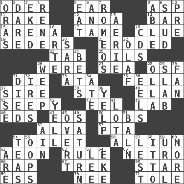 ACROSS 1. Baltic tributary 5. Ewer handle 8. Cleo's killer 11. Libertine 12. Small Philippine buffalo 14. Drinking establishment 15. Sports stadium 17. Docile 18. A slight indication 19. Spring feasts 21. Eaten away 23. Bar bill 25. Petroleums 26. We are 27. Ocean 28. Order of Saint Francis (abbr.) 31. Expire 33. _ moment's notice (2 wds.) 35. Man or boy (slang) 37. Beget 38. Filthy place 40. Style 41. Oozy 43. Snakelike fish 45. Experiment locale 46. Begley and Asner 47. Greek goddess of the dawn 50. Tennis shots 52. Inventor's middle name 53. Parent Teacher Assoc. 54. Bathroom 56. Plant genus of onion and garlic 61. A really long time 62. Governing power 65. Paris' subway 66. Hit sharply and swiftly 67. Long journey 68. Play the lead 69. Curvy letter 70. Born 71. Lacquered or enameled metalware DOWN 1. Mouths or openings 2. Have the gumption 3. Made supply last 4. French philosopher Descartes 5. Erode 6. Santa ___, CA 7. Lover boys 8. Competent 9. Saudi Arabian king (1953-1964) 10. Before (prefix) 13. Nest on high 16. Johnson of "Laugh-In" 18. Music discs 20. "Two Mules for Sister ____" 22. Norwegian king 24. Antes 26. Shed a tear 28. Water jar 29. Thick slice 30. Avid follower 31. Passed on 32. Angers 34. Had dinner 36. Snakelike fish 37. Compass dir. 39. Sharp bark 42. Shout 44. Globular water bottle used in Asia 48. Unconcealed 49. Titan orbits this 51. Lip ointment 52. The 18th letter of the Arabic alphabet 54. Afternoon social gatherings 55. I made a mistake 57. For fear that 58. "Tell ____ the Marines!" 59. Mountain range 60. Greater amount 61. "We ___ not amused" (Victoria) 63. Area sheltered from the wind 64. Supplement with great effort