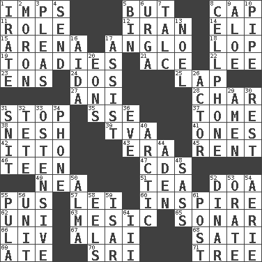 ACROSS 1. Naughty children 5. On the contrary 8. Head covering 11. Hero or heavy, e.g. 12. SW Asia republic 14. Biblical high priest 15. Sports stadium 17. White American of non-Hispanic descent 18. Chop off 19. Sycophants 21. Adept person 22. Area sheltered from the wind 23. Followers of ems 24. Two (Sp.) 25. Infant locale 27. Cuckoo 28. Burn to charcoal 31. Discontinue 35. Compass dir. 37. Heavy book 38. Soft 39. Federal power corp. 41. Singles 42. "Tell ____ the Marines!" 43. Epoch 45. Monthly bill 46. Adolescent 47. Music discs 49. Teachers' org. 51. Beverage made from leaves 52. ___ good deed 55. Ichor 57. Luau accessory 60. Heighten or intensify 62. Corn or form start 63. Of or pertaining to a meson 65. Echolocation 66. 54 in ancient Rome 67. Mountain range southwest of Kyrgyzstan 68. Suttee (variant) 69. Had dinner 70. Indian title of respect (Mr.) 71. Relationship diagram DOWN 1. Feeling or showing extreme anger 2. Person of subnormal intelligence 3. Entreaties 4. Post 5. Storage container 6. Capital and largest city of Mongolia 7. Baby powder 8. Portable communications device 9. _ vera 10. Corncob 13. Christmas carol 16. Opera by Verdi 17. Aid 20. Immeasurably long periods of time 26. Thespian 29. So be it 30. State of inaction 31. In a ____ (agitated or irritated) 32. False hair 33. Clearly or manifestly demonstrative 34. Give a jingle 36. First lady 40. Northern region 44. Arabian gulf 48. Backtalk 50. _ mater 52. Middle Eastern gold or silver currency 53. Speak pompously 54. Nest on high 55. Monetary unit of Botswana 56. A single undivided whole 58. Snakelike fish 59. Austrian river, tributary to the Danube 61. Mail 64. One more than two