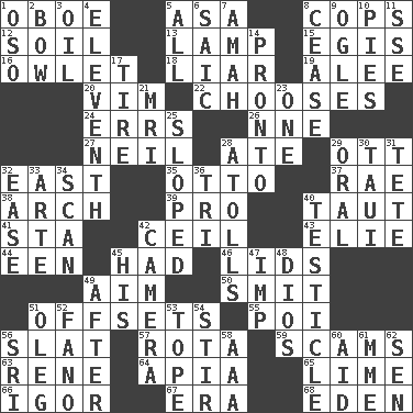 ACROSS 1. Mitch Miller's instrument 5. White ___ sheet 8. 911 reaches them 12. Earth 13. Desk light 15. The front part of a cuirass 16. A small or young owl 18. One who doesn't tell the truth 19. Toward shelter 20. Zeal 22. Elects 24. Blunders 26. Compass dir. 27. Famous astronaut Armstrong 28. Had dinner 29. Baseball player Mel 32. Compass direction 35. Von Bismarck 37. Actress Charlotte 38. Bowlike part 39. Adept person 40. Pulled tight 41. R.R. building 42. To provide with a ceiling 43. Writer Wiesel 44. Car or cant ending 45. Possessed 46. Hats (slang) 49. Direct toward a target or goal 50. Stricken, poetically 51. Counterbalances 55. Luau course 56. Narrow board 57. Round or rotation of duties 59. Fraudulent business schemes 63. French philosopher Descartes 64. Capital of Western Samoa 65. Welles in "The Third Man" 66. Russian composer Stravinsky 67. Epoch 68. Genesis locale DOWN 1. Bear (Spanish) 2. Ribbon knot 3. Petroleum 4. Veterans Day date 5. 100% 6. Ketch in the Levant 7. Nursemaid 8. Stop 9. Stare 10. Sliced desserts 11. Compass dir. 14. Right away 17. Hoop that covers a wheel 21. Medical imaging device (abbr.) 23. Single 25. Had an oblique or slanted direction 28. Ringlike coral islands and reefs 29. Of the mouth 30. "Change" in Tahitian 31. Wig 32. Comfort 33. Johnson of "Laugh-In" 34. Examine hastily 36. Three (prefix) 40. A testis 42. Device for capturing images 45. Part of HMS, perhaps 47. Mischievous child 48. "Vaya con ____" 49. Following 51. Cassini of fashion 52. Papal veil 53. Drink excessively 54. Use a swizzle stick 56. Indian title of respect (Mr.) 58. American Automobile Association (abbr.) 60. Help 61. Madame (abbr.) 62. Elected rep.