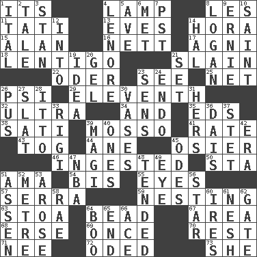 ACROSS 1. ___ a Wonderful Life 4. Desk light 8. French article 11. Jacques of French films 13. Nights before holidays 14. Israeli folk dance 15. ____ Jay Lerner 16. Remaining after all deductions 17. Hindu god of fire 18. Small, flat, pigmented spot on the skin 21. Killed 22. Baltic tributary 23. Perceive with the eye 25. Fish or hair follower 26. Air pressure measure (abbr.) 29. Veterans Day date 32. Extremist 34. Plus 35. Begley and Asner 38. Suttee (variant) 39. With motion or animation 41. Pace 43. Coat; cloak 44. A saturated hydrocarbon 45. Flexible twig of a willow tree 46. Swallowed 50. R.R. building 51. Housemaid (var.) 54. Twice 55. Sight organs 57. Spanish missionary in California 59. Nestling 63. Portico 64. Necklace unit 67. Type of rug 68. Celtic language 69. At one time in the past 70. State of inaction 71. Born 72. Wrote a lyric poem 73. A female animal or person DOWN 1. Slanted text style (abbr.) 2. Story 3. Comedian Laurel of Laurel & Hardy 4. Poe poem 5. "___ Maria" 6. Was introduced to 7. Pacific Standard Time (abbr.) 8. Utah city north of Ogden 9. Bert's buddy 10. Virtuous person 12. To the inside or interior of 14. Actor Linden 19. It may be bright or harebrained 20. Set 21. Arrange properly for use 23. Elected reps. 24. Inside; within (prefix) 26. Suppuration 27. Narrow board 28. "Tell ____ the Marines!" 30. Flower holders 31. Possessive pronoun 33. Swiss mountan, "Queen of the Mountains" 36. Raised platform 37. Proofreading order 39. Wise men 40. Washington bills 42. Epoch 45. Lyric poems 47. Basketball assoc. 48. Looked after 49. Sight organ 51. NE Netherlands city 52. Distance measurement (Brit.) 53. Came up 56. Play the lead 58. Actress Charlotte 60. Angers 61. Tender 62. Yard entry 64. Surprise greeting 65. Conclusion 66. Adept person