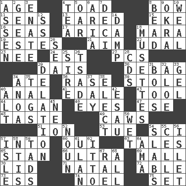 ACROSS 1. Grow older 4. Frog relative 8. Arrow shooter 11. Elected reps. 13. Having ears or earlike features 15. Make supply last 16. Oceans 17. N. Chile seaport 18. Hindu Mythology: god of death 19. _____ Park, CO 21. Direct toward a target or goal 22. Allodial 23. Born 24. Eastern Standard Time (abbr.) 27. Personal Computers (abbr.) 29. Raised platform 30. Debunk (Brit. slang) 34. Had dinner 36. Raze (variant) 39. Took without asking 40. Of or related to the anus 41. Peak District village in England 43. Instrument 44. Utah city north of Ogden 46. Snake ____ (dice throw) 47. Compass dir. 48. Clothes sense 49. Crow sounds 51. Electrically charged atom 53. Third day of the wk. 54. _-fi 57. To the inside or interior of 60. Fr. "Yes" 63. Falsehoods 65. Comedian Laurel of Laurel & Hardy 66. Extremist 69. Promenade 70. Hat (slang) 71. Brizilian seaport 72. Competent 73. Curvy letter 74. Christmas carol 75. Arrange properly for use DOWN 1. NE Netherlands city 2. Honkers 3. Related on the mother's side 4. Afternoon social gathering 5. Rowing implement 6. Roberta Peters solo 7. Tenth: prefix 8. Necklace unit 9. Gumbo ingredient 10. Welt 12. Compass dir. 14. Moist 18. French bagpipes 20. Ocean 25. Male parent of an animal 26. Sadhe (variant) 28. Music discs 29. Conveyance 31. Expressions of contempt or scorn 32. Medicinal plant 33. Set 34. Small Philippine buffalo 35. Labels 37. Declare 38. Voters do this 40. The first octave above the treble staff 42. Son of Isaac 45. Modern: prefix 50. Dripping 52. Part of speech 54. Broad, flat, thick pieces 55. Cell (Danish) 56. Small island 57. Small island 58. Nuclear Threat Initiatives 59. Small amounts or degrees 61. ____ Bator 62. "Tell ____ the Marines!" 64. Nanny (var.) 67. Actress Charlotte 68. Everything