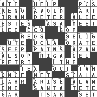 ACROSS 1. Had dinner 4. Assist 8. Personal Computers (abbr.) 11. Western Nevada city 13. Keep away from 15. Nonscientific branch of learning 16. SW Asia republic 17. Prevent from occurring 18. Toward shelter 19. _____ Park, CO 21. White ___ sheet 22. Confront 23. Area sheltered from the wind 24. Environmental prefix 27. Republican Party 29. Vintage cars 30. Major League Baseball Commissioner Bud 34. Shoshoni 36. Southern CA. univ. 39. Declaim 40. Ooze 41. Aches 43. Muslim summons to prayer 44. Columnist Joseph or Stewart 46. Capital of Latvia 47. Set 48. _ dish (used to culture cells) 49. Welles in "The Third Man" 51. John Ritter's dad 53. Sep. follower 54. Scottish cap 57. At one time in the past 60. Was introduced to 63. Any of the three canals of the cochlea 65. Cowardly lion portrayer 66. Originate 69. ____ Jay Lerner 70. Compass dir. 71. Before Barbara or Clara 72. False hair 73. Slender fish 74. Russian ruler of old 75. Arrange properly for use DOWN 1. Satellite of Uranus 2. Laconic 3. Maternal 4. Possessed 5. Night before a holiday 6. Globular water bottle used in Asia 7. Sliced desserts 8. Diluted with white 9. Algonquian 10. Proofreading order 12. Single 14. To trail on the ground 18. Electrical Measurement 20. Perceive with the eye 25. Overturn; upset 26. Witty Wilde 28. Bear (Spanish) 29. Newsperson 31. Goldbrick 32. Slanted text style (abbr.) 33. Commissioned military rank (abbr.) 34. Ubangi River tributary 35. Trial 37. Cards in a Roman deck? 38. White American of non-Hispanic descent 40. Plant excrement 42. Ketch in the Levant 45. Sliced dessert 50. Mountains (abbr.) 52. Dec. holiday 54. Falsehoods 55. Having winglike extensions 56. French painter Edouard 57. Cassini of fashion 58. Grandmother 59. "Mermaids" star 61. Part of Q.E.F. 62. Metal containers 64. Domesticated feline 67. R.R. building 68. Ewer handle