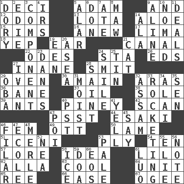 ACROSS 1. Tenth: prefix 5. First of billions? 9. Also 12. Aroma 13. Globular water bottle used in Asia 14. Medicinal plant 15. Basketball hoops 16. Afresh 17. Pale green bean 18. Slangy assent 19. Ewer handle 21. Lessep's creation 22. Lyric poems 24. R.R. building 26. Begley and Asner 27. Silly 28. Stricken, poetically 29. Baking chamber 30. At full speed 32. Caspian sea tributary 36. Object of repulsion 37. Petroleum 38. Flatfish 39. Pismires 40. Abounding in pines 42. Examine minutely or intensely 43. Inconspicuous attention getter 44. 1973 Nobel Price Winner (Physics) Leo 46. Opposite of masc. 49. Baseball player Mel 50. Unable to walk 51. Ancient Celtic tribe of eastern Britain 53. Travel a route regularly 54. Nine, plus one 57. Old wives' tales, e.g. 58. The main thing one is thinking about 61. _ and Stitch 62. Silent film actress Nazimova 63. Calm and collected 64. A single undivided whole 65. Portuguese money of account (variant) 66. Comfort 67. Double curve, resembling the letter S DOWN 1. Dinghy 2. Singer Brickell 3. Piece 4. Big collection agency 5. Having or resembling wings 6. Spanish title 7. Had dinner 8. Opening into something insatiable 9. Place in a line 10. Wanderer 11. Allots cards 14. Wing 19. Car or cant ending 20. Toward the sea 21. Feline 23. Natives or inhabitants of Denmark 24. Grin 25. Shallow baking pan 27. "Terrible" tsar 28. Virtuous person 29. Chief or king in Benin or Nigeria 31. Wet 32. Indian state 33. Shooting up abruptly 34. Jai ____ 35. Elected rep. 40. Pacific Standard Time (abbr.) 41. Shout 43. Luau course 45. Declare 46. Of or pertaining to a thread or threads 47. Learning spot: Fr. 48. Haggard of country music 52. Teachers' org. 53. Diluted with white 55. Writer Wiesel 56. Musical sound 58. Frozen water 59. ___ good deed 60. Greek goddess of the dawn 61. Nilotic language