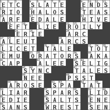 ACROSS 1. And so on (abbr.) 4. Chalkboard 9. Extremities 13. River (Sp.) 14. Radiant circles of light 15. Afternoon social gatherings 16. Sandy's bark 17. Peak District village in England 18. Hub of activity 19. Lizard (obsolete) 21. Falsehood 22. Agitated, as a liquid 24. One of the Great Lakes 26. Curve 27. Eskimo relative 29. Arches 30. It is permitted: Lat. 31. Lie 33. Small child 36. Australian flightless bird 37. Speakers 40. Alias (abbr.) 41. Head covering 42. Toward shelter 43. Major League Baseball Commissioner Bud 45. Synchronize (abbr.) 47. Falsehoods 48. Born 49. Inconspicuous attention getter 50. Came up 52. Health resort 54. Make lace 56. One who doesn't tell the truth 57. Practice fights 59. Flaplike covering 61. Singer Brickell 62. Table seasonings 63. Compass dir. 64. Without 65. Take or capture by force 66. Elected rep. DOWN 1. Epoch 2. Become fatigued 3. Java holder (2 wds.) 4. A female animal or person 5. Dipping utensil 6. Mountain range southwest of Kyrgyzstan 7. Lacquered or enameled metalware 8. Compass dir. 9. Value system 10. Famous astronaut Armstrong 11. American folk hero Crockett 12. Compass dir. 20. Loyal 22. More uncommon 23. The grampus (Milton) 25. "Tell ____ the Marines!" 27. Actor Baldwin 28. Pale green bean 29. _ vera 31. Baby powder 32. Had dinner 33. Baron Munchausen's specialties 34. Migrant worker of the '30s 35. Labels 38. Indian princess (variant) 39. Fast planes 44. Compass direction 45. Sounds asleep 46. Consenting reply 49. Components 50. Opera by Verdi 51. Water falling in drops from the sky 52. Coast Guard woman 53. Light colored 55. Prong on a fork 56. French article 57. Compass dir. 58. Fast jet (abbr.) 60. Lair